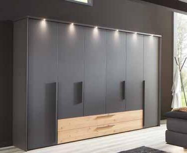 8 Drehtürenschrank Lando 6-türig mit 2 Schubkästen, Ausführung Lack Schiefergrau matt, Balkeneiche Furnier, ca. B302 x H223 x T 59 cm