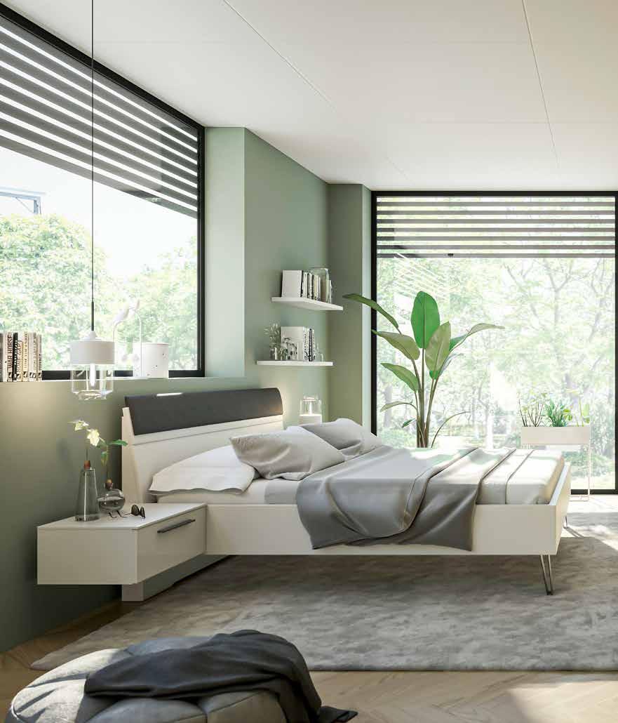 7 Doppelbett in Lack Biancoweiß matt und Kopfteilpolster, Füße Metall platin matt, ca. 180 x 200 cm, inklusive 2 Hängekonsolen