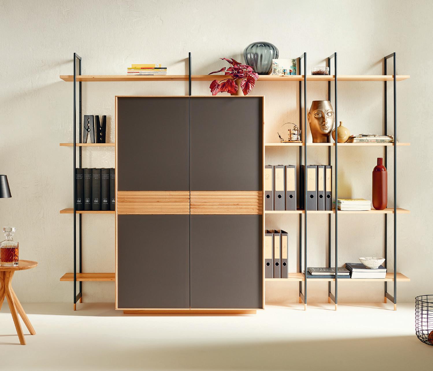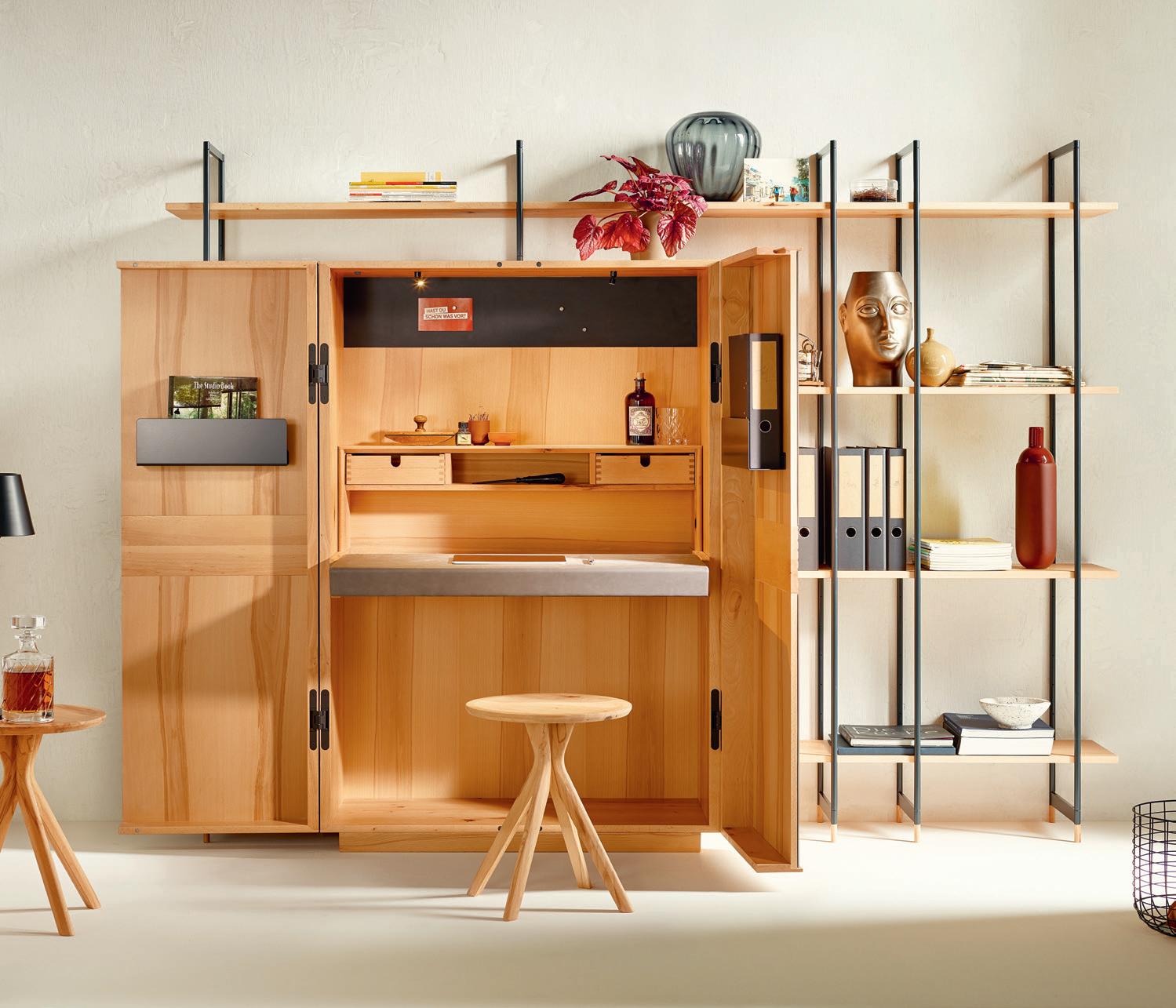 HOME-OFFICE / Schreibtischplatte zum Herausziehen, Hocker zum Hineinstellen, Steckdosenleiste zum Energieladen, Led-Points zum Dazubestellen und die Regale rundherum ganz nach Wunsch oder gar nicht. So schön kann Arbeiten zu Hause sein.