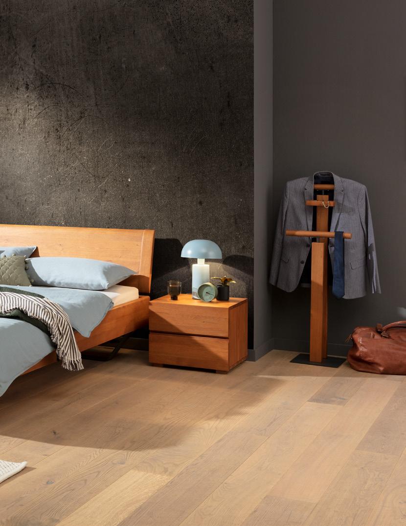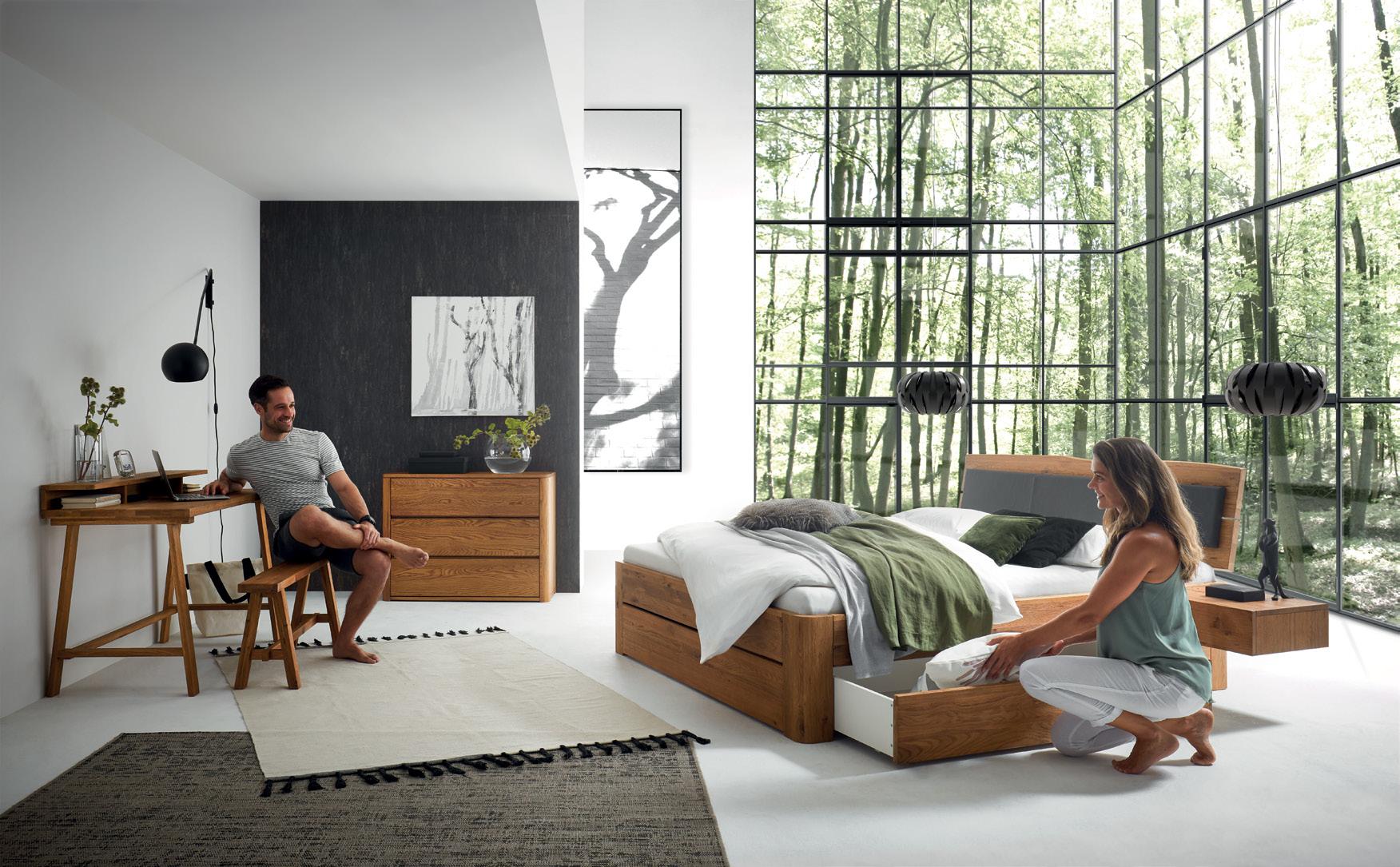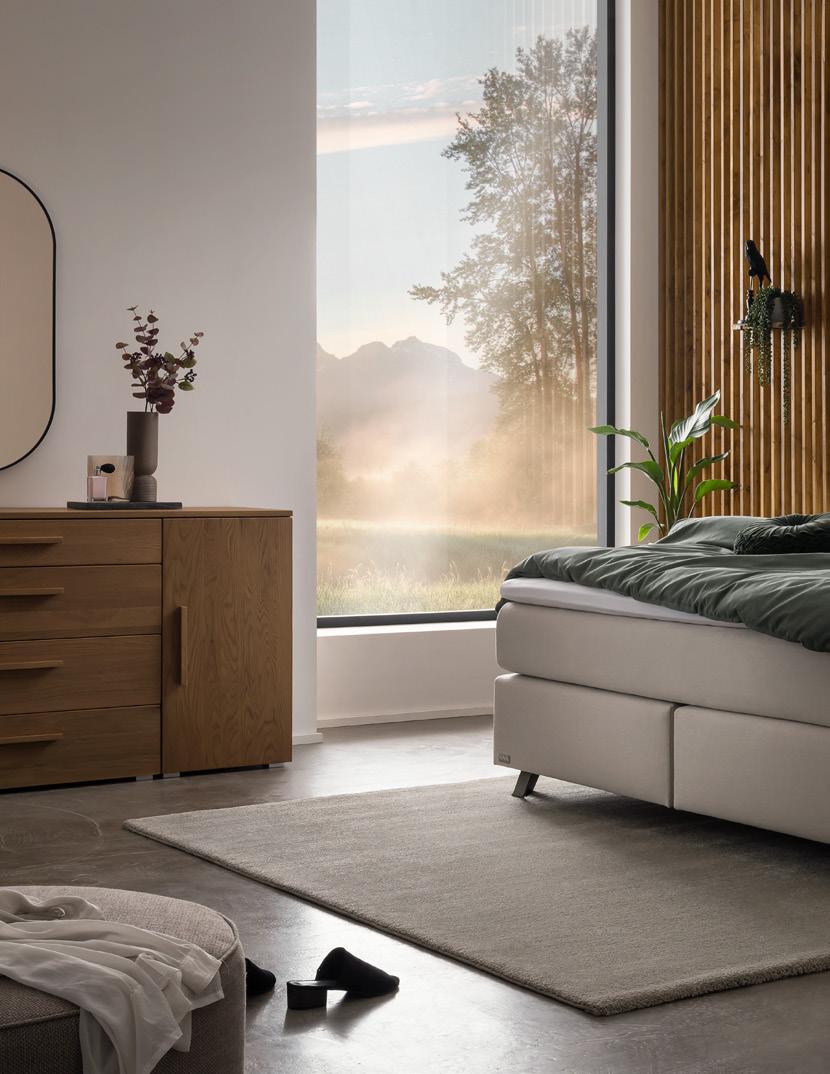 Unsere Wood-Line-Modelle sind in einer Vielzahl von Buchen-Ausführungen erhältlich, die von klassisch bis modern reichen. Sie können zwischen verschiedenen Farbtönen und Oberflächenstrukturen wählen, um das perfekte Möbelstück zu finden, das Ihrem persönlichen Geschmack und Einrichtungsstil entspricht. Besonders herausragend ist unsere aussergewöhnliche Kernbuche, die mit ihrer natürlichen Schönheit und Einzigartigkeit begeistert. Jedes Möbelstück zeigt natürlich gewachsene Unregelmässigkeiten in Farbe, Maserung und Oberfläche, die ihm einen unverwechselbaren Charakter verleihen. Kein Stück gleicht dem anderen, und das macht unsere Möbel zu individuellen Kunstwerken, die Ihr Schlafzimmer zum strahlenden Mittelpunkt machen. Die Verwendung von hochwertigem Buchenholz gewährleistet nicht nur die Langlebigkeit unserer Möbel, sondern sorgt auch für eine warme und gemütliche Atmosphäre in Ihrem Schlafzimmer. In unserem Wood-Line Sortiment bieten wir neuerdings auch zwei Eicheausführungen an. Das natürliche Holz strahlt eine beruhigende und einladende Wirkung aus und schafft eine Verbindung zur Natur, selbst inmitten des urbanen Lebens.