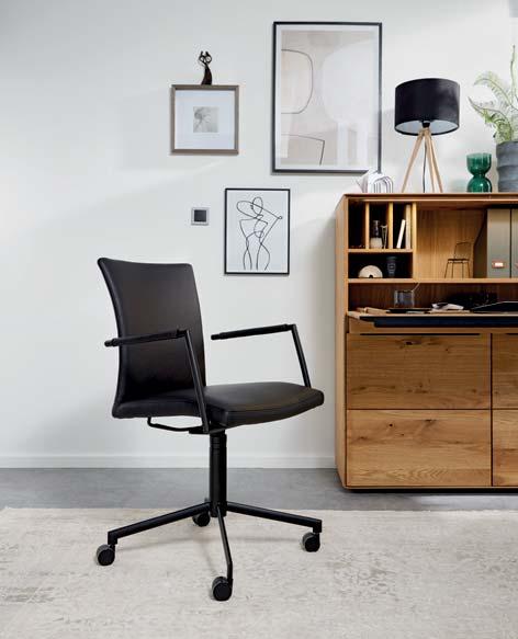 Stuhl HELMOND in Leder Toledo (1) nero, Gestell schwarz mit Rollen, ca. B 55, H 91, T 58 cm Stuhl HELMOND in Stoff 24075 braun grau JAB ANSTOETZ (JAB 2), Gestell schwarz, ca. B 56, H 91, T 58 cmVerwandlungssideboard PUERTO in Eiche massiv, bianco, ca. B 182, H 76, T 60 cm, ausgeschwenkt T 228 cm