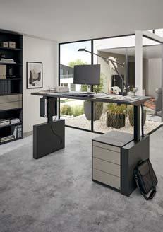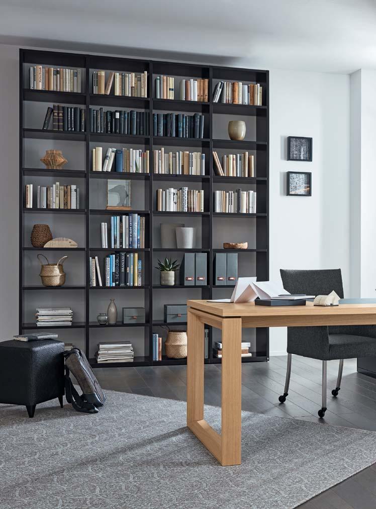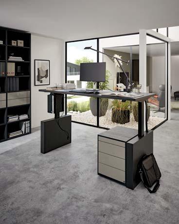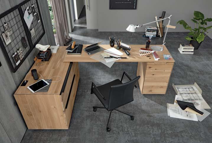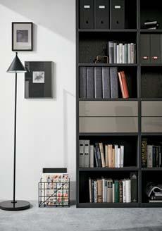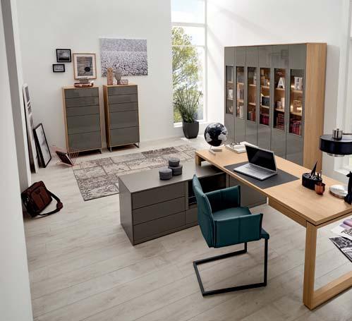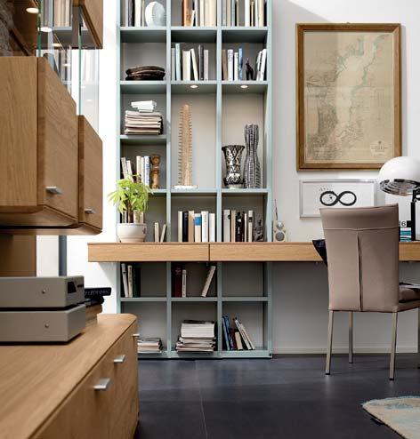 In den Wohnraum integriert! Mit flexiblen Möbelsystemen lassen sich nicht nur Wohnund Esszimmer passgenau einrichten, auch ein Arbeitsplatz kann exakt nach Ihren Wünschen integriert werden. So spiegelt sich die neue Work-Life-Balance unmittelbar im Mobiliar wider: Wohnen und Arbeiten wachsen zusammen, Wohneinrichtung und Homeoffice gehen nahtlos und harmonisch ineinander über. Nie war das Heimbüro gemütlicher!