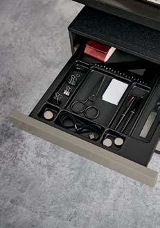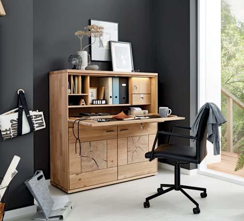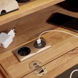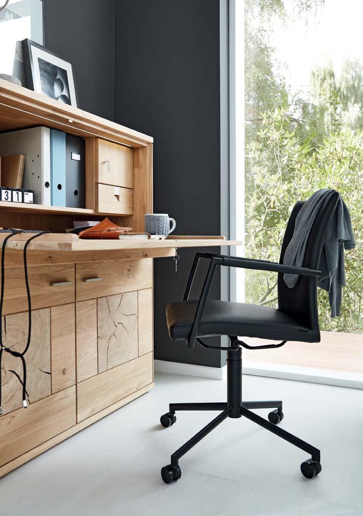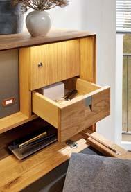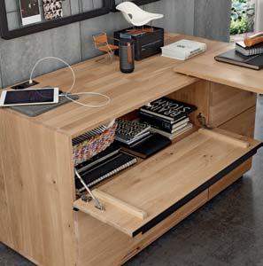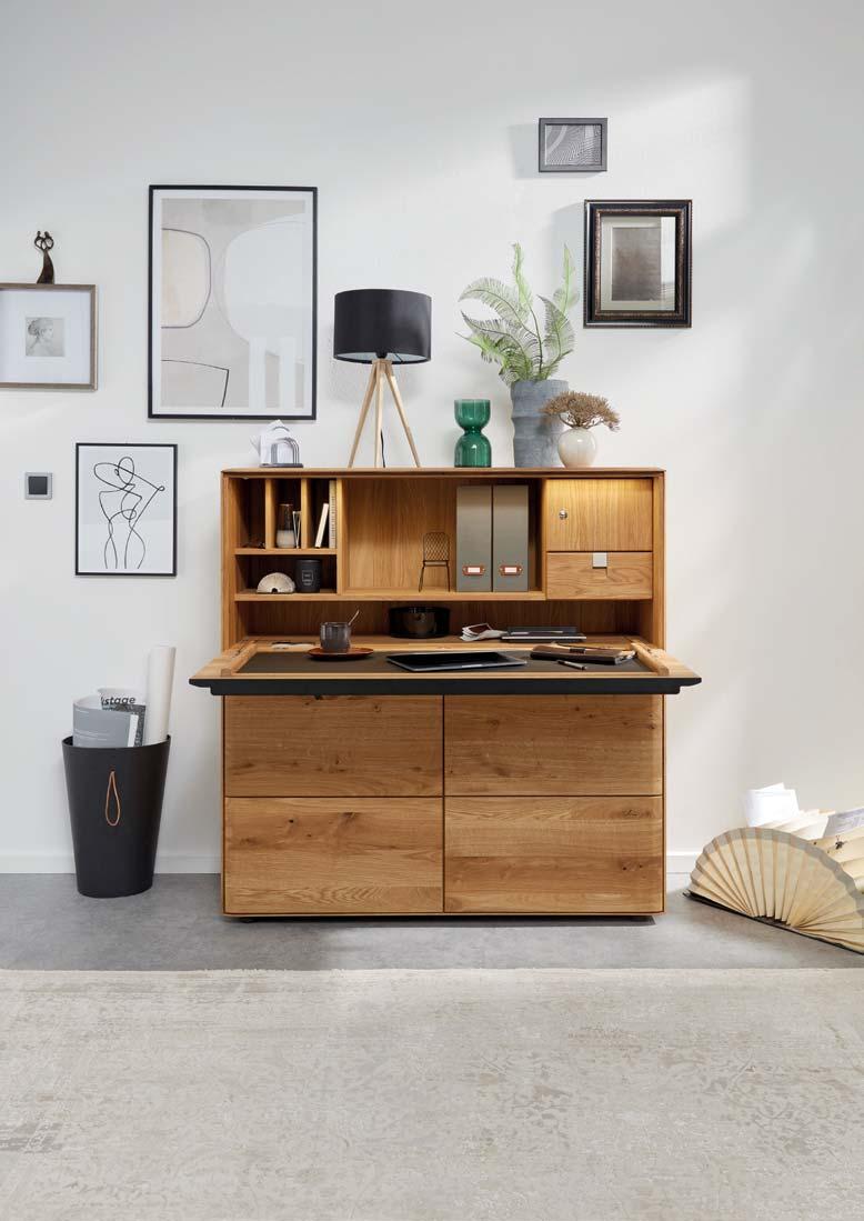 praktischen Kabeldurchlass ausgestattet. Damit Ihrem Laptop, Tablet oder Smartphone nie der Saft ausgeht, ist der Oberboden mit einer Steckdose und zwei USB-Ladeanschlüssen lieferbar. Und wenn die Arbeit getan ist? Dann lässt sich der Schreibtisch mit wenigen Handgriffen wieder in ein attraktives Sideboard verwandeln – und vom Homeoffice ist nichts mehr zu sehen.