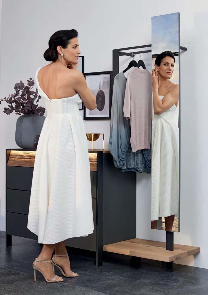 Stimmen Sie die einzelnen Elemente der Garderobe geschickt aufeinander ab. Wenn der Spiegel oder ein Hängepaneel in der gleichen Breite gewählt wird wie die Kommode oder das Schrankelement darunter, entsteht ein besonderer Eindruck von Einklang und Harmonie