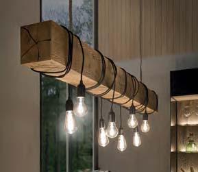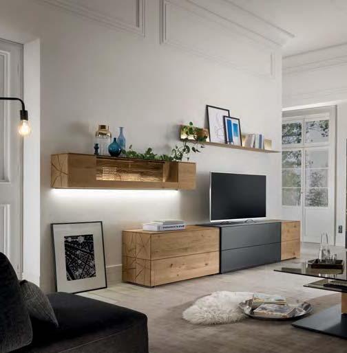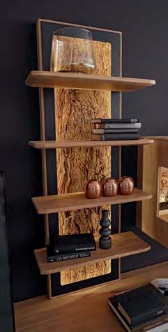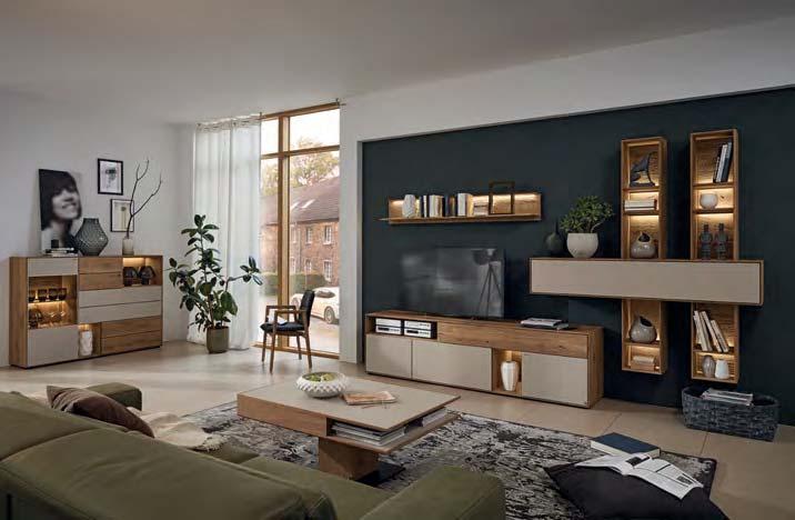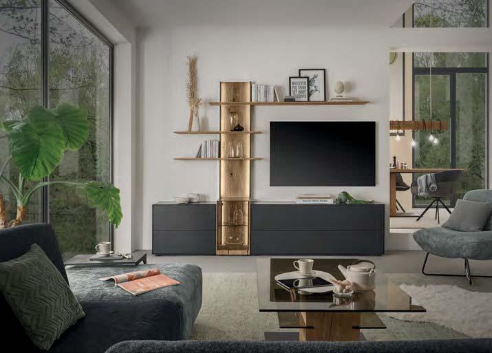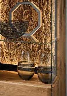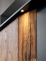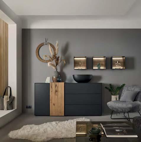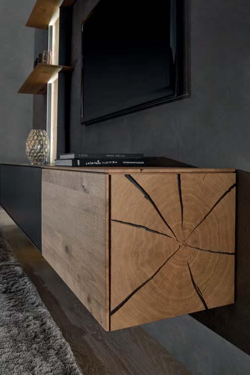 liches Highlight sind die Spaltholz-Absetzungen mit ihrer reliefartigen Struktur. Eine stimmungsvolle LED-Beleuchtung hebt die Dreidimensionalität dieser Applikationen deutlich hervor. Der Kontrast zwischen den urwüchsigen Massivholzelementen und den glatten Lackfronten verleiht dem Raum Spannung und Charakter. Auch für die Farbgestaltung ergeben sich interessante Möglichkeiten: Wenn der Raum überwiegend in Grau und Anthrazit gehalten wird, treten die Massivholzflächen umso deutlicher hervor.