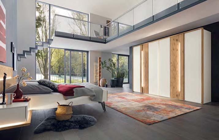 Schließen Modernität und Gemütlichkeit einander aus? Natürlich nicht, wie unser Schlafzimmer JOLINE eindrucksvoll beweist. Einerseits kommt die geradlinige Formensprache sicher sehr zeitgemäß daher, die Lackfronten in Graphit oder Weiß sowie die schnörkellosen Griffe und Metallelemente unterstreichen den modernen Gesamteindruck. Doch an Wärme und Behaglichkeit mangelt es deshalb nicht. Die Oberflächen in massiver Wildeiche verzaubern den gesamten Raum mit ihrem natürlichen Charisma. Ein zusätz-