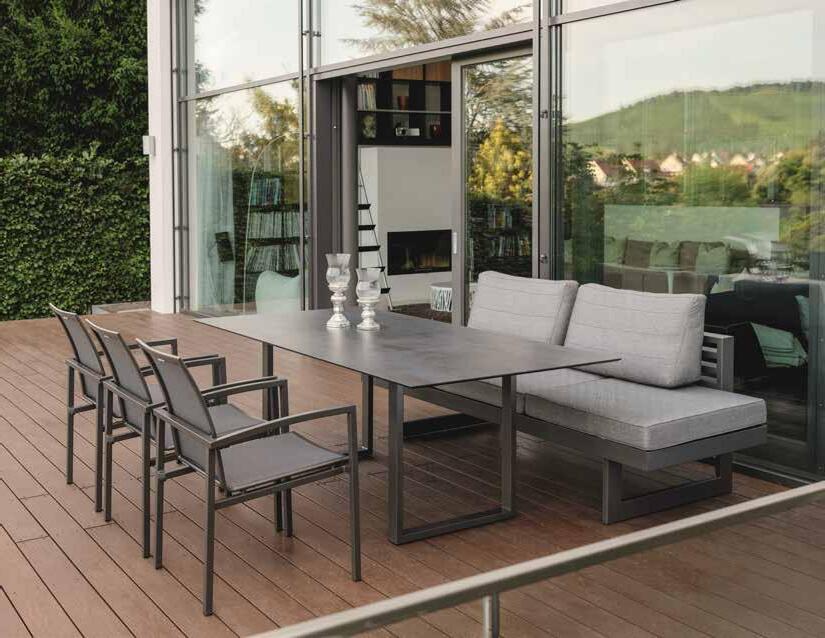 Diese DINING-LIEGE macht Ihre Terrasse zum Urlaubsort! An beiden Enden mehrfach verstellbar. Lieferbar in verschiedenen Farben, ca. B 216 x T 80 x H 92 cm (inkl. Rückenkissen), Auch in geringerer Sitzhöhe als Loungesofa lieferbar.