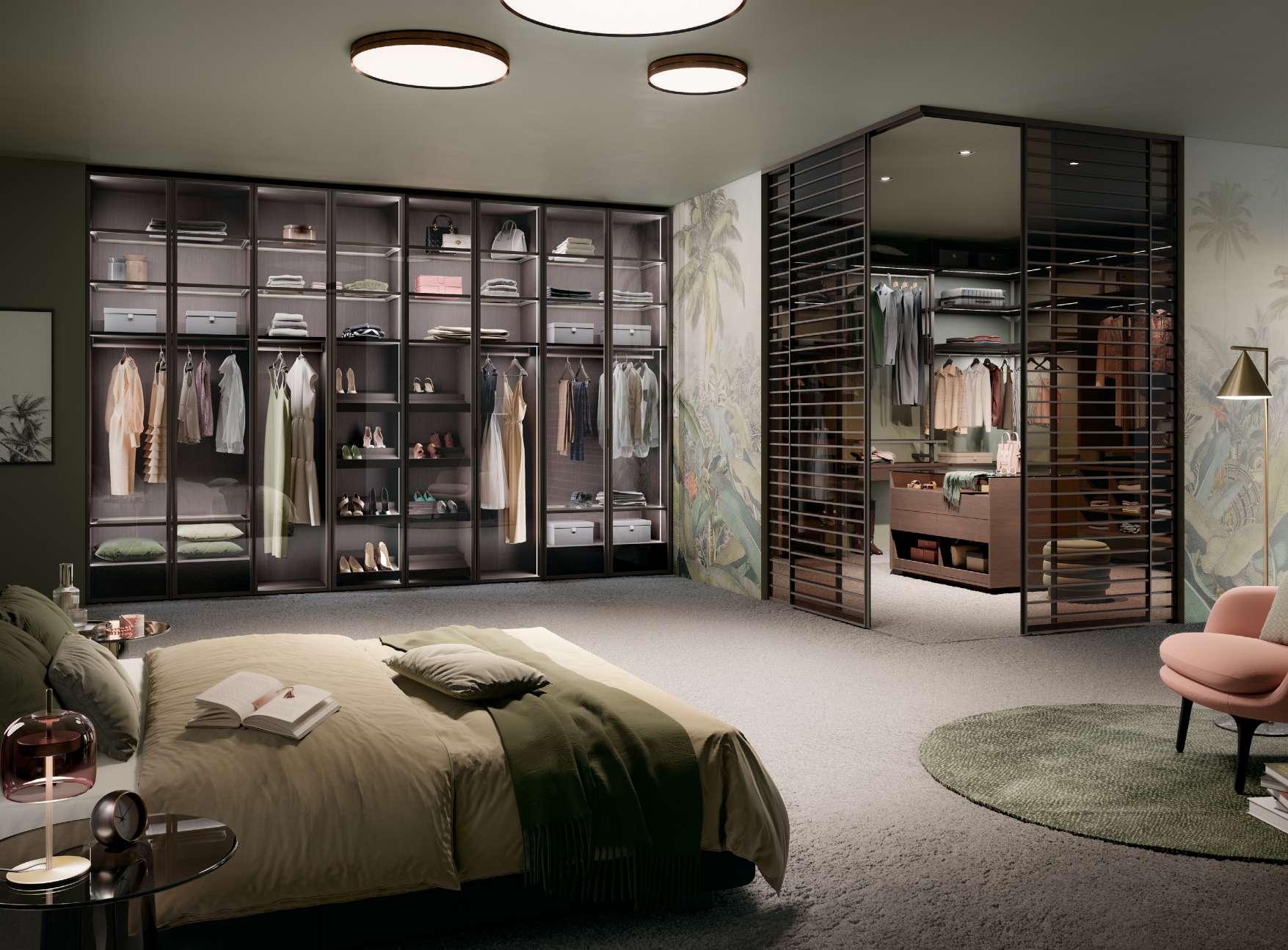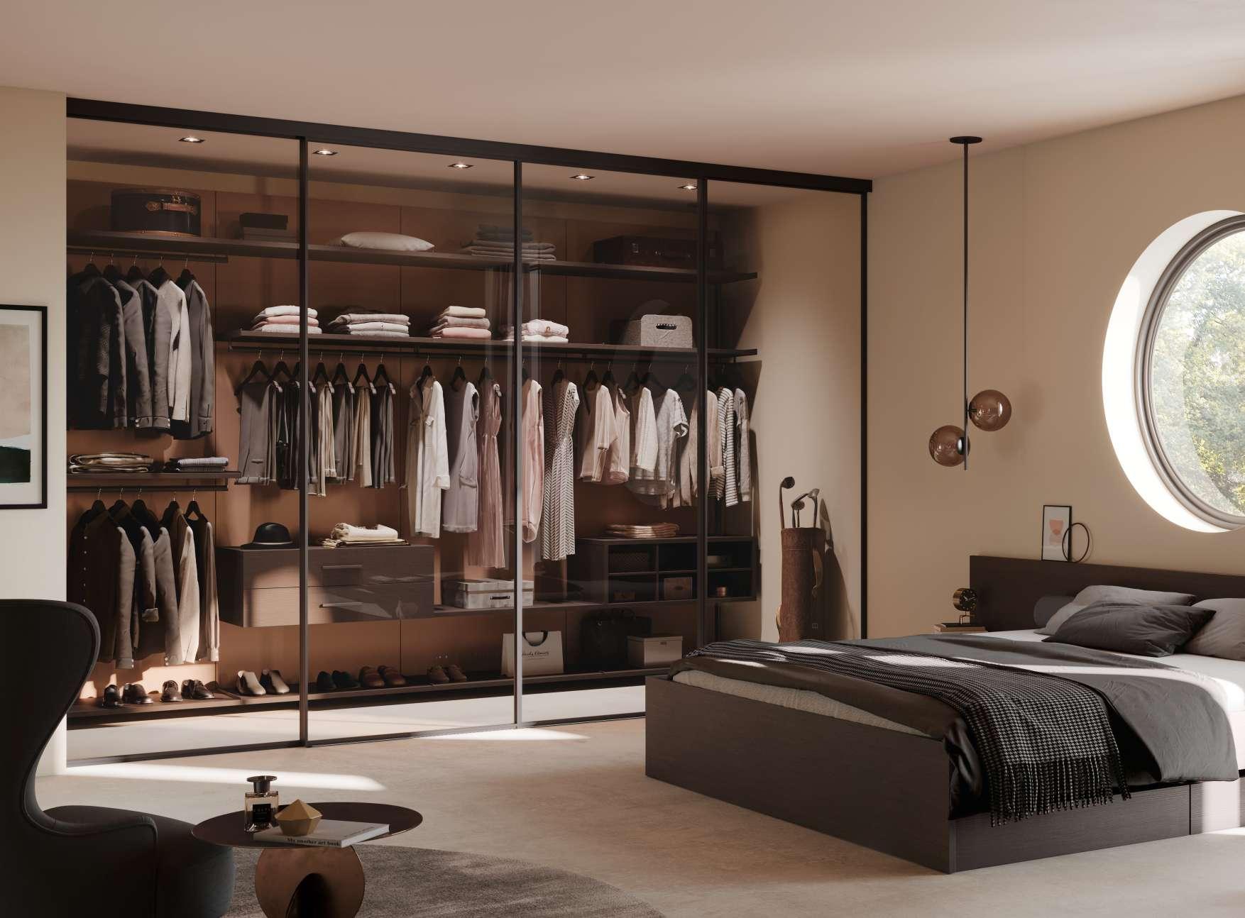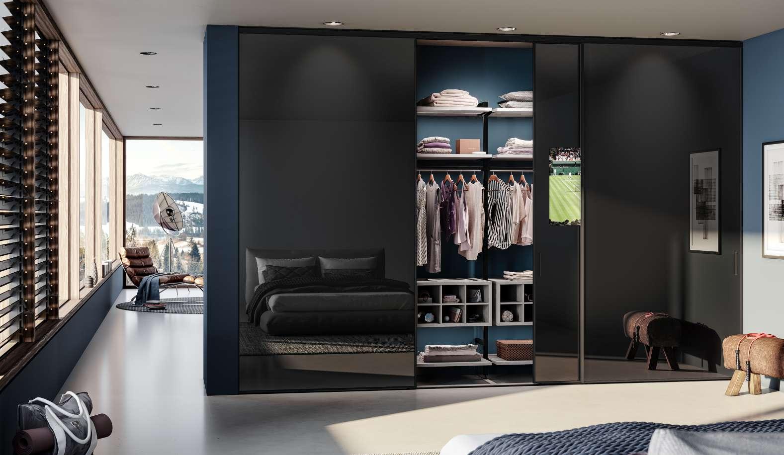 Hier behalten Sie immer den Durchblick, denn Kleidung, Schuhe und Accessoires finden maßgeschneiderten Stauraum, der alles stets in Reichweite und Bestform hält. Mit klug strukturiertem Platz ist es keine Kunst, die einmal definierte Ordnung zu halten. Das Ergebnis kann sich jederzeit sehen lassen – am schönsten durch unsere eleganten Gleittüren mit Klarglas-Füllung.