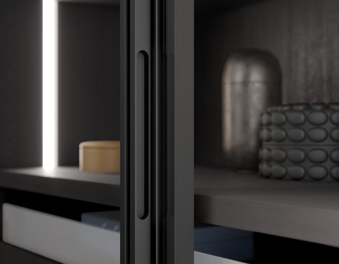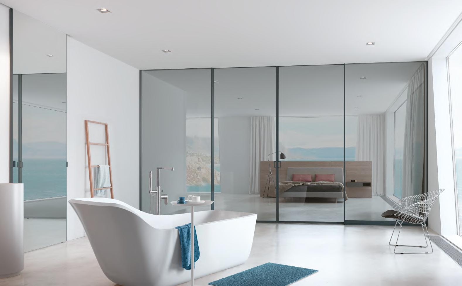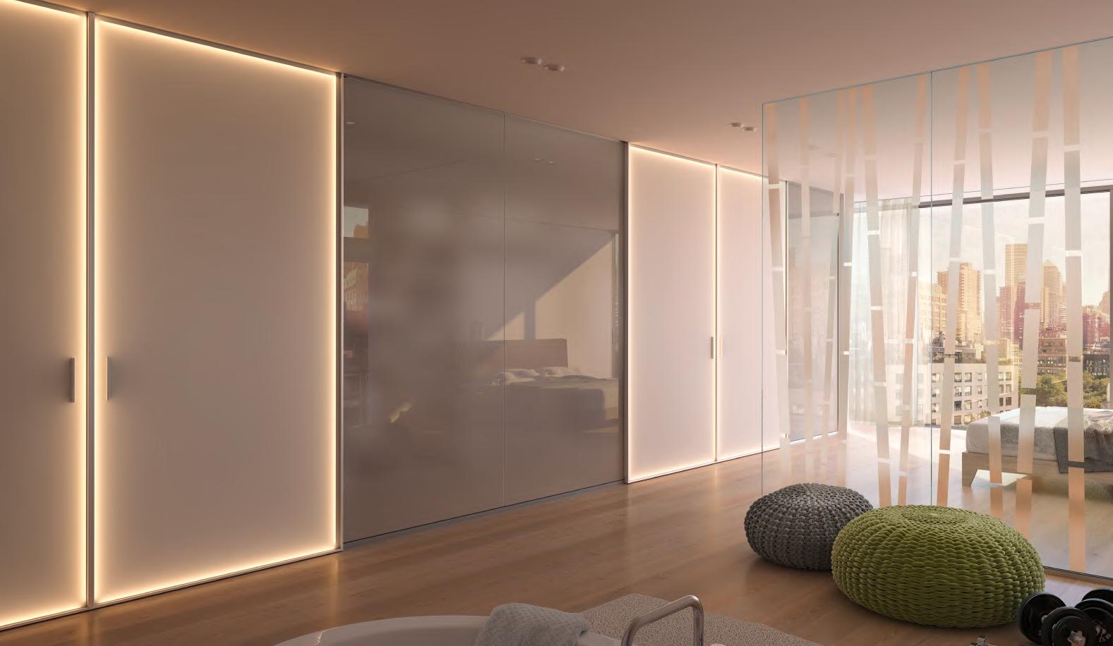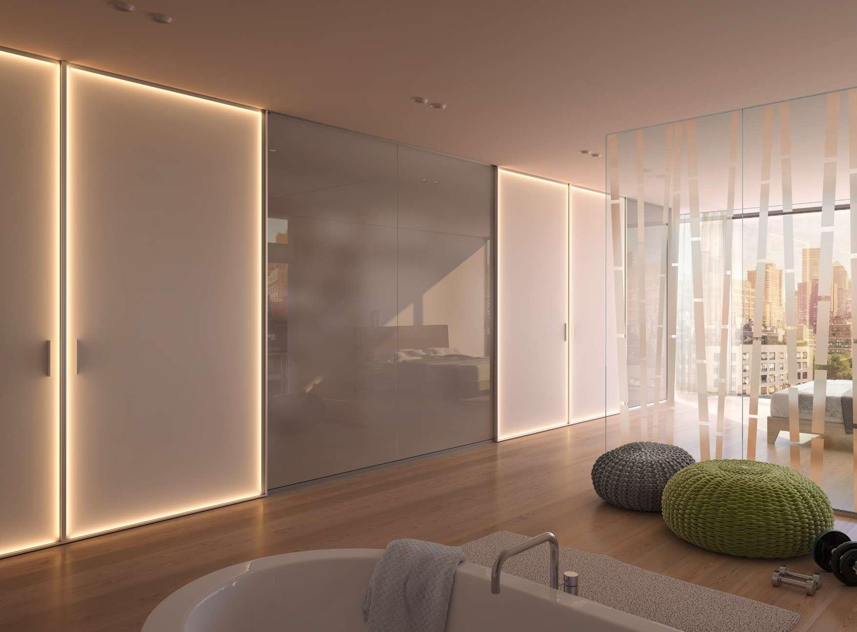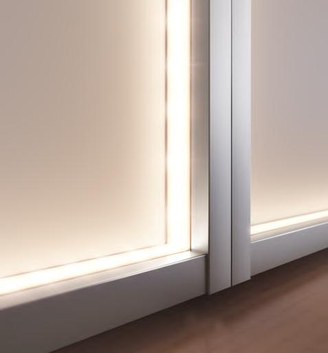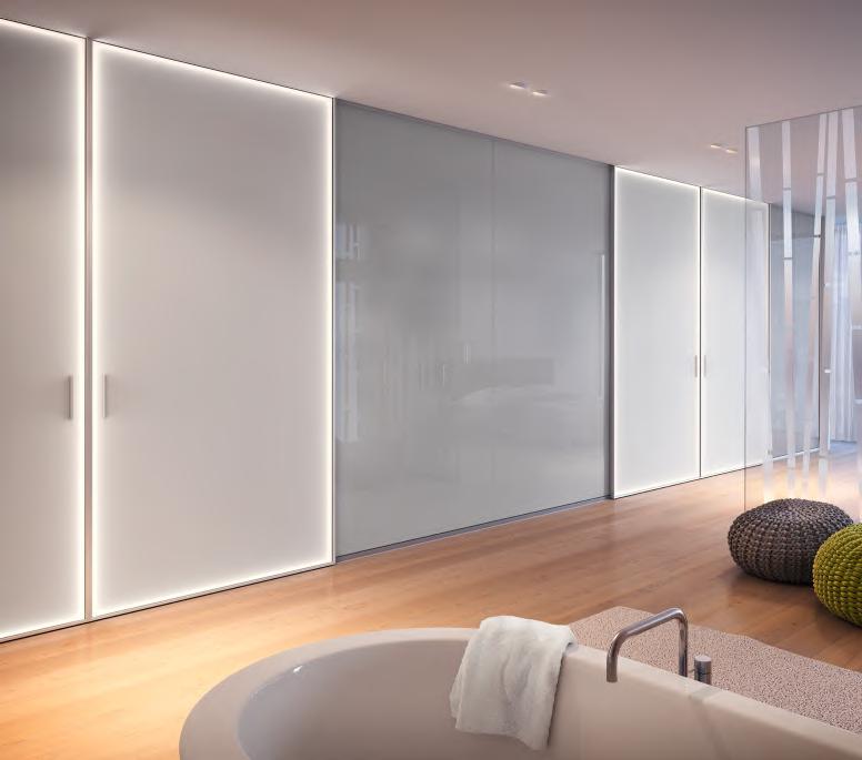 Highlight für den Raum. Gleittüren mit integrierter LED-Beleuchtung setzen ebenso sanfte wie exklusive Akzente im Raum. Die steuerbare Lichtfarbe passt sich dem Biorhythmus und dem eigenen Wohlbefinden an.