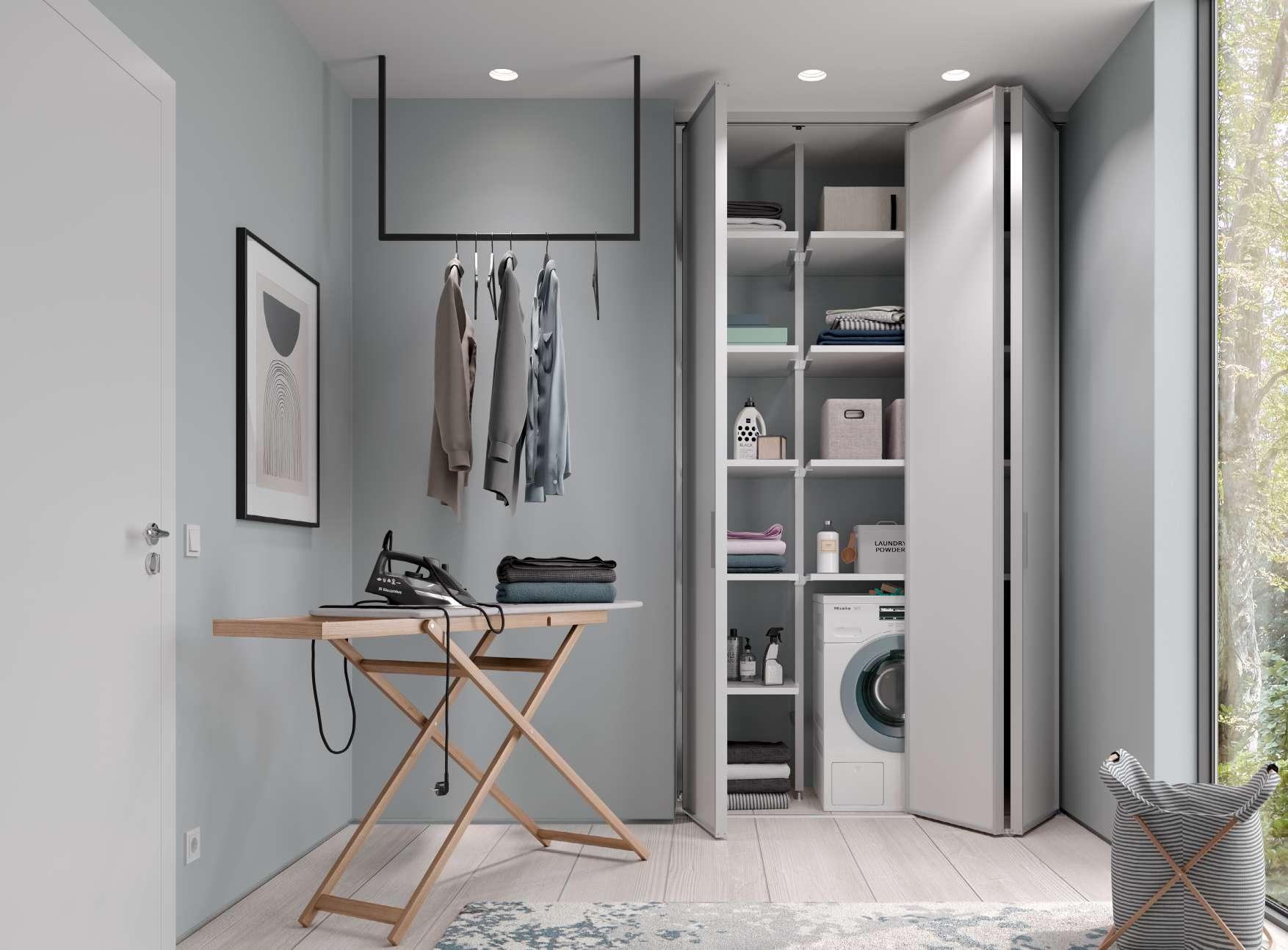 raumplus hat für jede Nische die passende Lösung. So verwandelt die Falttür selbst kleine Räume in multifunktionale Wasch- & ServiceCenter – mit cleverer Technik und minimalem Platzbedarf.
