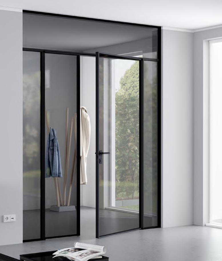 raumplus offers solutions of format. The two-part swing door with additional transom window and sidelites fills large wall openings both attractively and functionally. Despite its size, it maintains visual lightness - with transparent or opaque door panels.