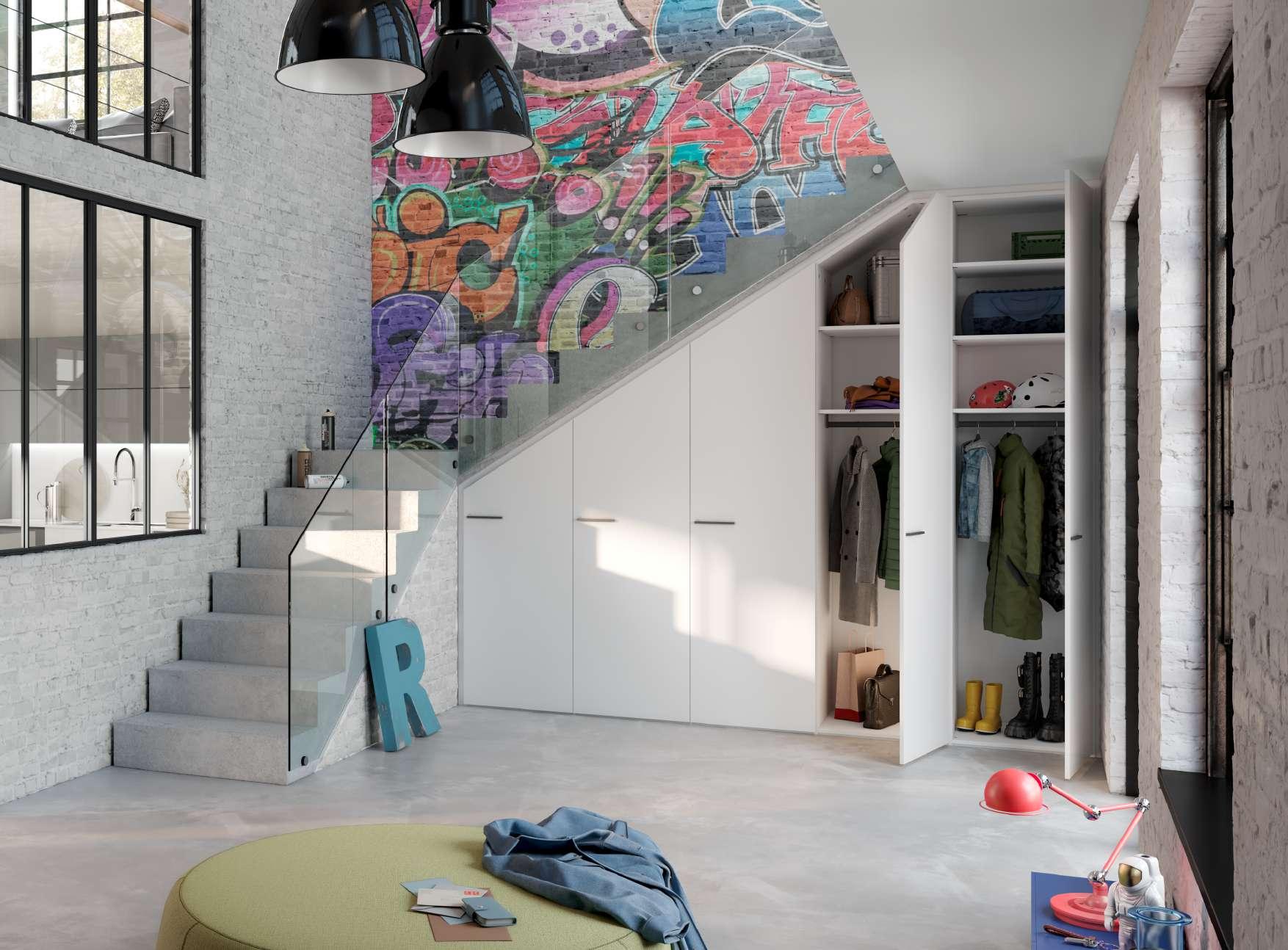 Nutzen Sie jeden Winkel nach Ihren Wünschen. Unter Treppen und Dachschrägen lassen sich sowohl Gleit- als auch Drehtüren passgenau einbauen. Diese sorgen für Raumgewinn und bringen Kleidung, Akten, Staubsauger und mehr ästhetisch unter.