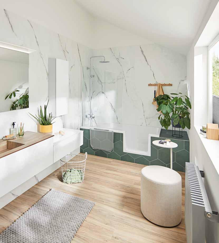 Der aktuelle Badtrend „Wanne raus, Dusche rein“ ist mit RenoDeco ohne schmutzige Fliesenarbeiten schnell und sauber umsetzbar. RenoDeco ist die ideale Alternative zu einer zeit- und kostenintensiven Komplett- oder Teilsanierung des Badezimmers. Ist beispielsweise die Verfugung des Duschbereichs brüchig und defekt oder soll eine hohe Dusch- oder Badewanne durch eine barrierefreie Lösung ersetzt werden, kann RenoDeco die alte oder fehlende Verfliesung abdecken.