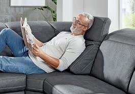 In dieser praktischen Relax-Ecke können Sie den Alltag hinter sich lassen. Der Winkel lässt sich in beide Richtungen verstellen und das Kopfteil kann der Neigung angepasst werden. Für langes Sitzen ohne Verspannung. Mehrpreis 219,- zuzügl. Kopfteilverstellung.