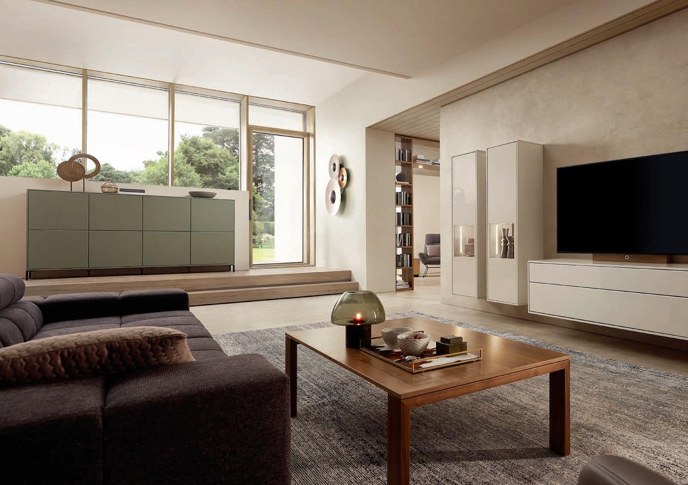 Lackfarben matt &Hochglanz Highboard, B/H/T 243,2 x 120,5 x 39,6 cm, Lack Olivgrau matt, Griff Push to open Couchtisch CUBE, B/H/T 120 x 40 x 75 cm, Nussbaum Nova ohne Deko, Beleuchtung und Zubehör 10.267Artikel 9Furnierhölzer 24Lackfarben ∞ Möglichkeiten 1perfekte Lösung für Sie Planungsbeispiel (Preis ohne Deko) 4.997,-