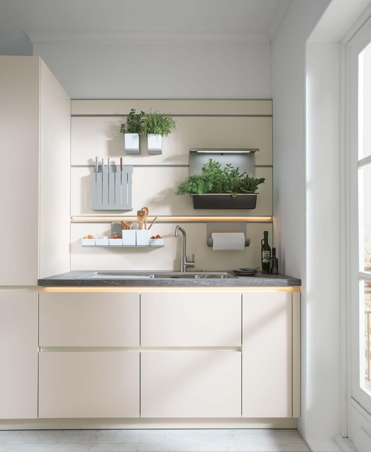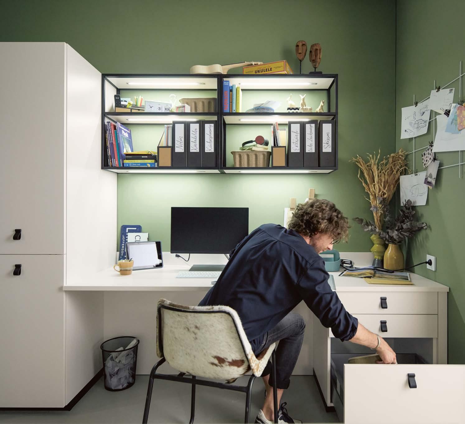 Wenn das Office ins eigene Zuhause verlagert wird, ist lösungsorientiertes Denken gefragt. Daher gilt es, das jeweilige Platzangebot optimal zu nutzen. So verschwinden Arbeitsmaterialien in den Oberschränken mit praktischer Faltklappe sowie den Unterschränken, die sowohl dezent mit Tip-On, als auch mit extravaganten Ledergriffen versehen werden können. Für die perfekte Ausleuchtung des Arbeitsbereichs sorgt die stilvolle Integration des Lichts in die darüber positionierten Frame Racks oder Oberschränke.