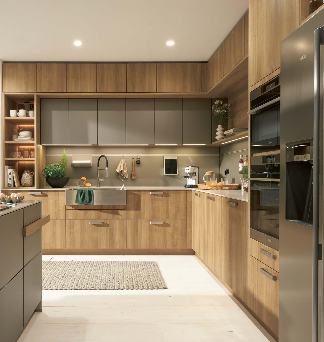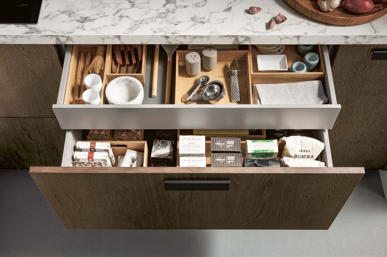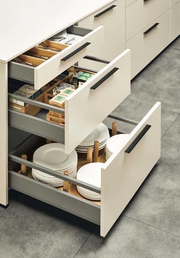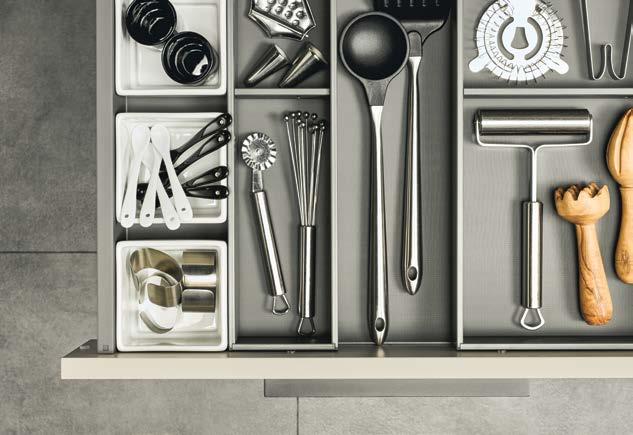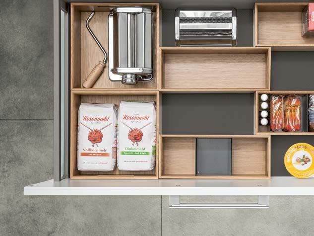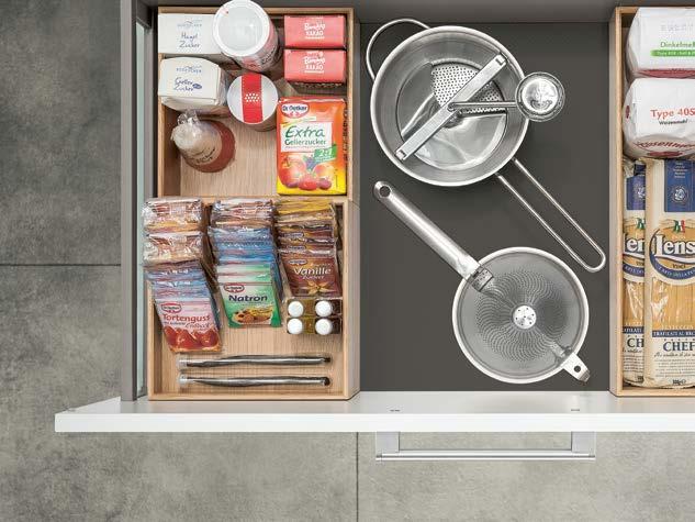Besondere Elemente der Innenausstattung machen die Küche perfekt: je nach individuellen Ansprüchen wird dank verschiedener Besteck- oder Funktionseinsätze, beispielsweise für Messer oder Gewürze, der Raum zu einer ProfiKochwerkstatt. Auch für besondere Stauraumbedürfnisse in den unteren Auszügen bieten wir eine Lösung: die Einsätze aus eleganter Eiche natur lassen sich flexibel an Porzellan, Kochutensilien oder Vorräte anpassen – so sind sämtliche Küchenhelfer perfekt organisiert.