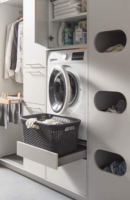 Ergonomisch hoch eingebaut: die Waschmaschine oder der Wäschetrockner im Hochschrankregal. Mit stabilem wie praktischem Schubkasten für Kleinteile, auf dem auch der Wäschekorb abgestellt werden kann.