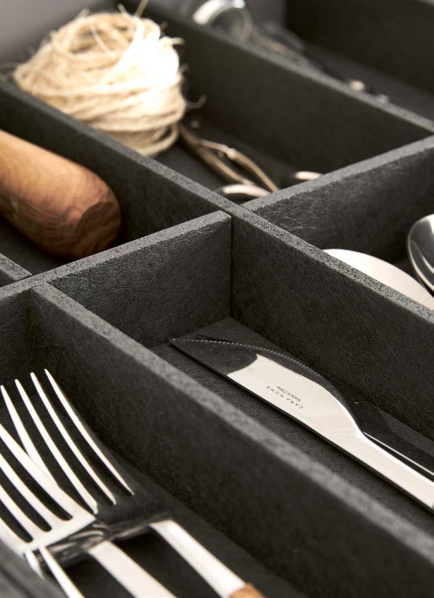 Ästhetik, Ordnung und Umwelt vereinen sich zur Innenausstattung OrganiQ in lavaschwarz: Perfekt aufeinander abgestimmte Elemente wie Besteck- und Funktionseinsätze bieten eine ideale Lösung um Porzellan, Kochutensilien oder Vorräte wie Gewürzdosen einzulagern. Die flexiblen Einsätze bestehen zu 78 % aus Naturfasern (hauptsächlich Hanf und Kenaf), was sie besonders ressourcenschonend, langlebig und umweltverträglich macht.