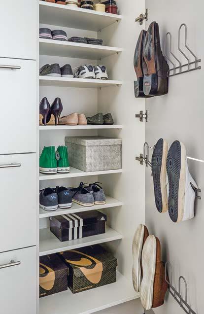 Der übersichtliche Schuh-Hochschrank bietet eine Menge Platz und garantiert Überblick. Selbst die Tür wird noch als Schuhaufbewahrung genutzt. Die gekürzten Korpusunter- und -oberböden sorgen für Belüftung.