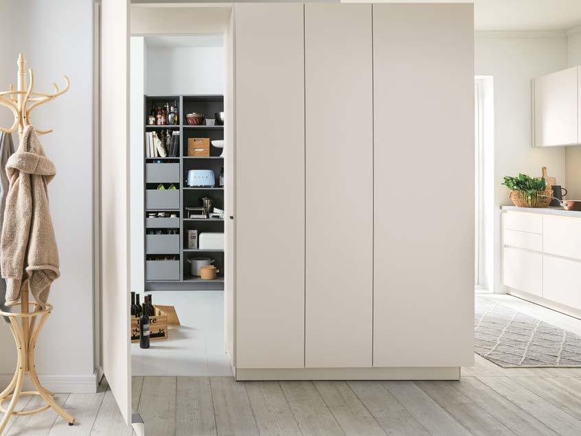 Eine praktische Lösung für alle, die Ruhe in den Raum bringen möchten. Die Durchgangstüre versperrt den Blick in die Speisekammer auf elegante Art und Weise und mutet geschlossen wie ein Hochschrank an. Dadurch fügt sie sich harmonisch in das Gesamtbild ein. Dank der Tip-On Funktion lässt sich die Durchgangstüre selbst mit vollen Händen bequem öffnen.