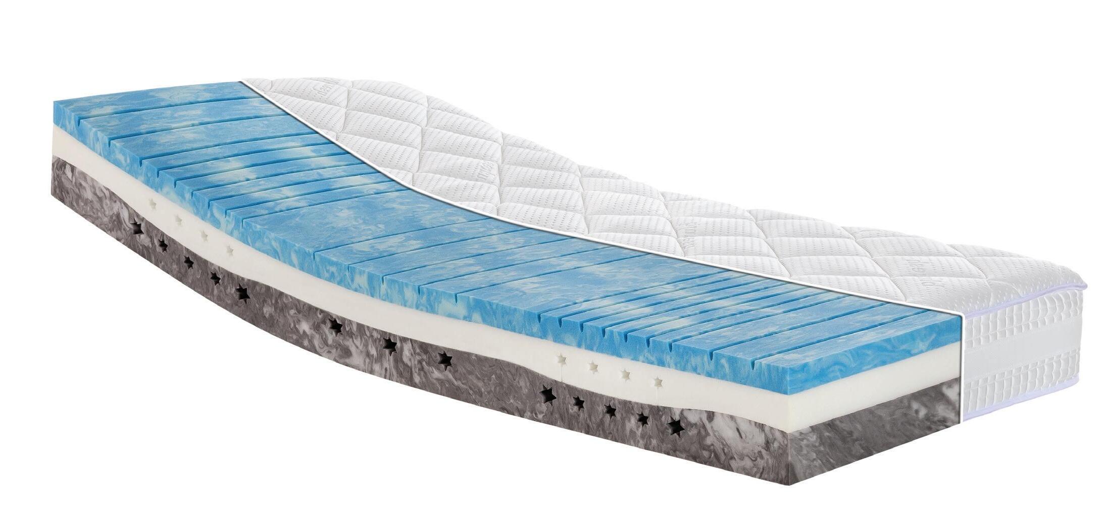Ca. 17 cm hoher 2-Schicht-Kombikern, obere Schicht aus gelartigem Spezialschaum zur perfekten Druckentlastung, Trägerschicht hochwertiger Kaltschaumkern mit Schulterkomfortzone, Rundum-Bezug aus seidenweichem Tencel®Verbundstoff (61 % Polyester, 39 % Lyocell), Wendegriffe, rundum Abstandsgewirke.