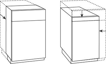 Abweichende Frontaufteilung. Nischenposition / -anordnung inkl. Innenraum- und Frontmaßänderungen bei gleichen Schrankmaßen. Frontüberstände bei Ober- und Unterschränken und im Hochschrankbereich. sind sowohl seitlich, oben und nach unten realisierbar.