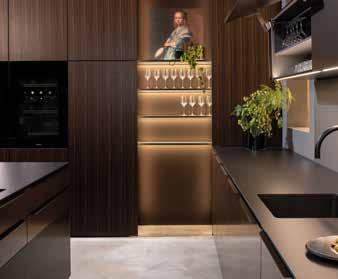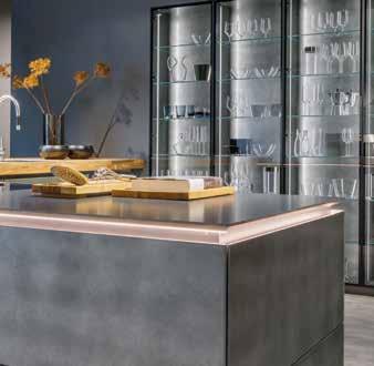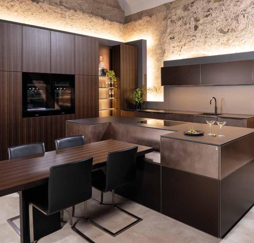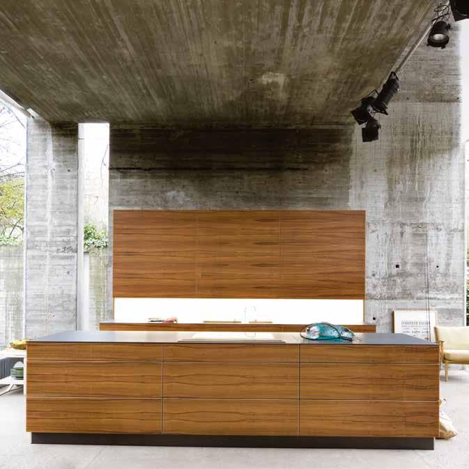 Raumübergreifende Elemente lassen die Küche zum Funktions- und Wohnbereich miteinander verschmelzen und bauen den Kommunikationsmittelpunkt Küche als soziales Zentrum des Wohnbereichs aus.