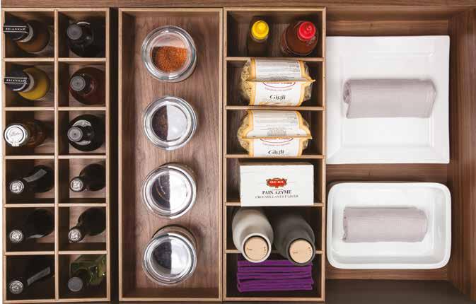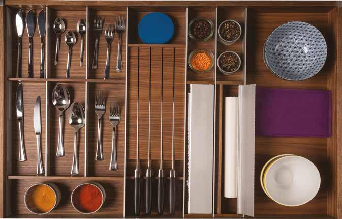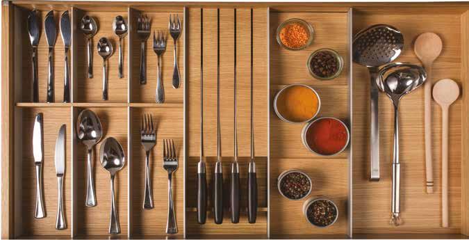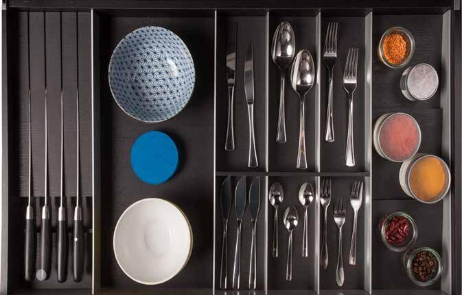 Innenorganisationssysteme Emplex und TA’OR – individuell angefertigt je nach Abmessungen der Schubkästen in Eiche, Nussbaum und im Falle TA’OR auch in schwarz.