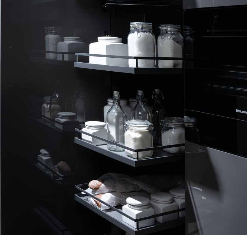Ob nun als Vorratsschrank mit Schwenkbeschlag oder als Apothekerschrank mit Vollauszug und Eckunterschränke mit “LE MANS” Schwenkbeschlag. Immer im eleganten Farbton Anthrazit gehalten.