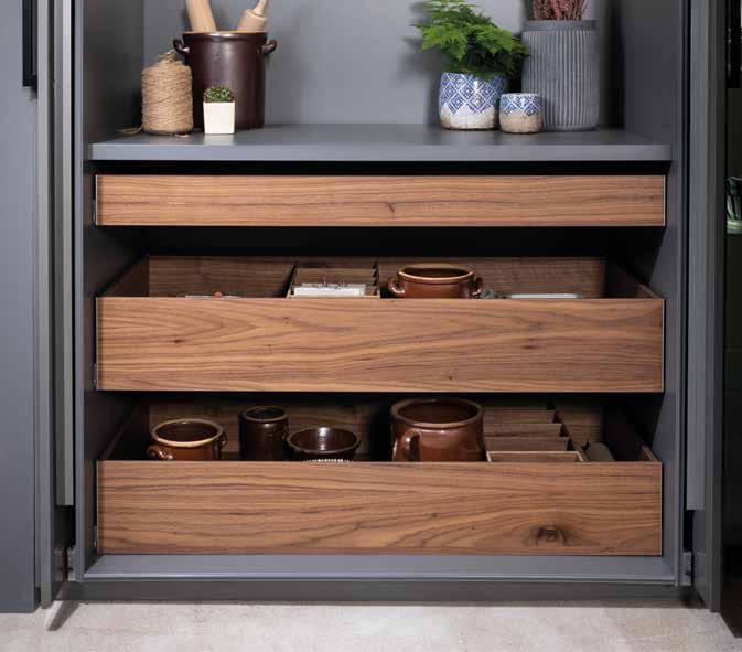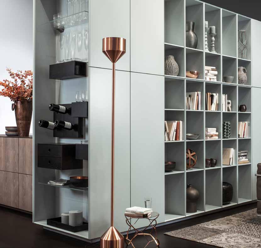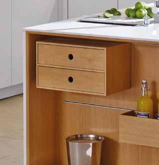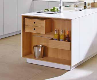Die neuen Konturregale mit sichtbaren Holzschubkästen unterstreichen die horizontale Linienführung einer Küchenplanung. Die Regale sind in unterschiedlichen Dekoren und Farben lieferbar.