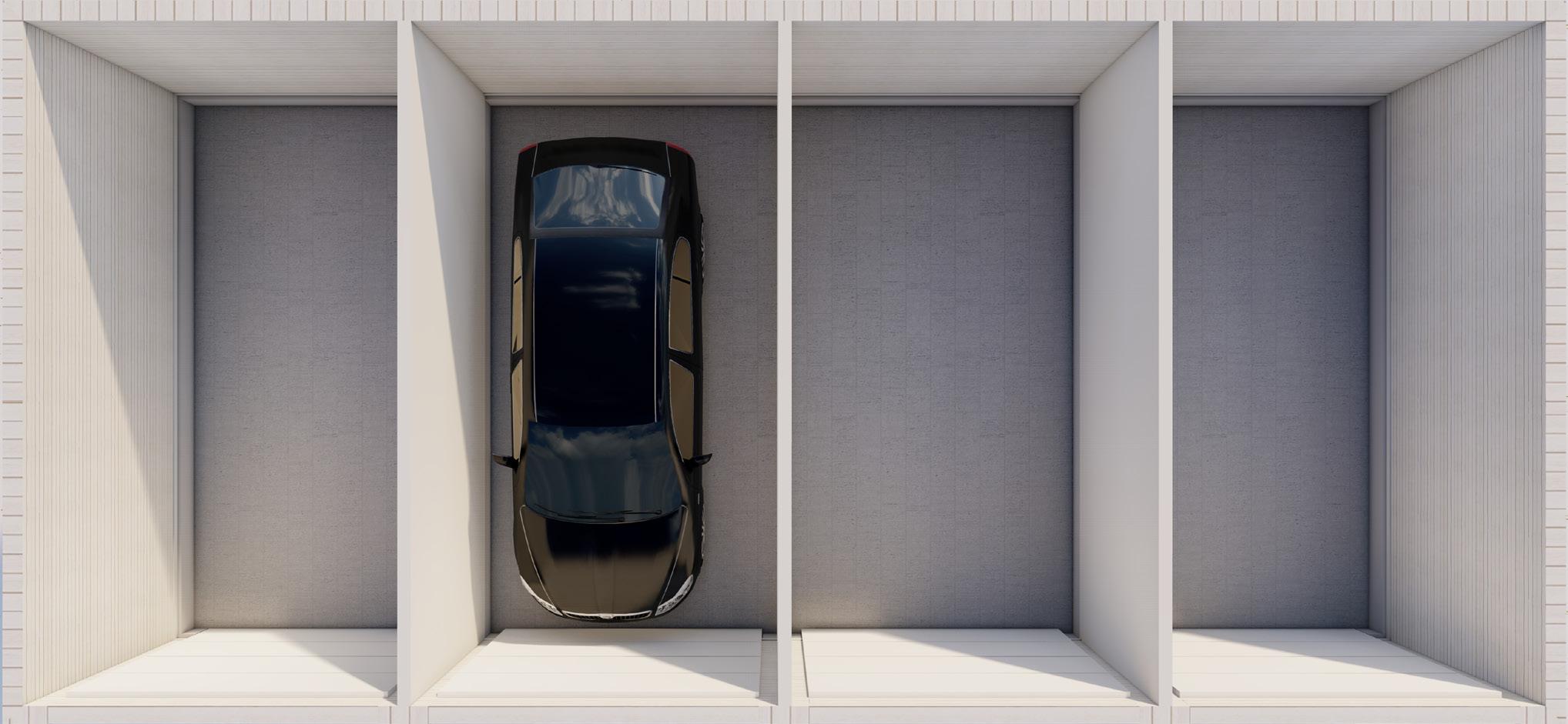En rekkegarasje gir effektiv parkering for flere biler på et begrenset område. Skissen viser en standard størrelse, men det er mulig å utvide både i bredden og dybden på rekkeanlegget slik at du i tillegg kan få gode lagringsmuligheter i garasjerommet.