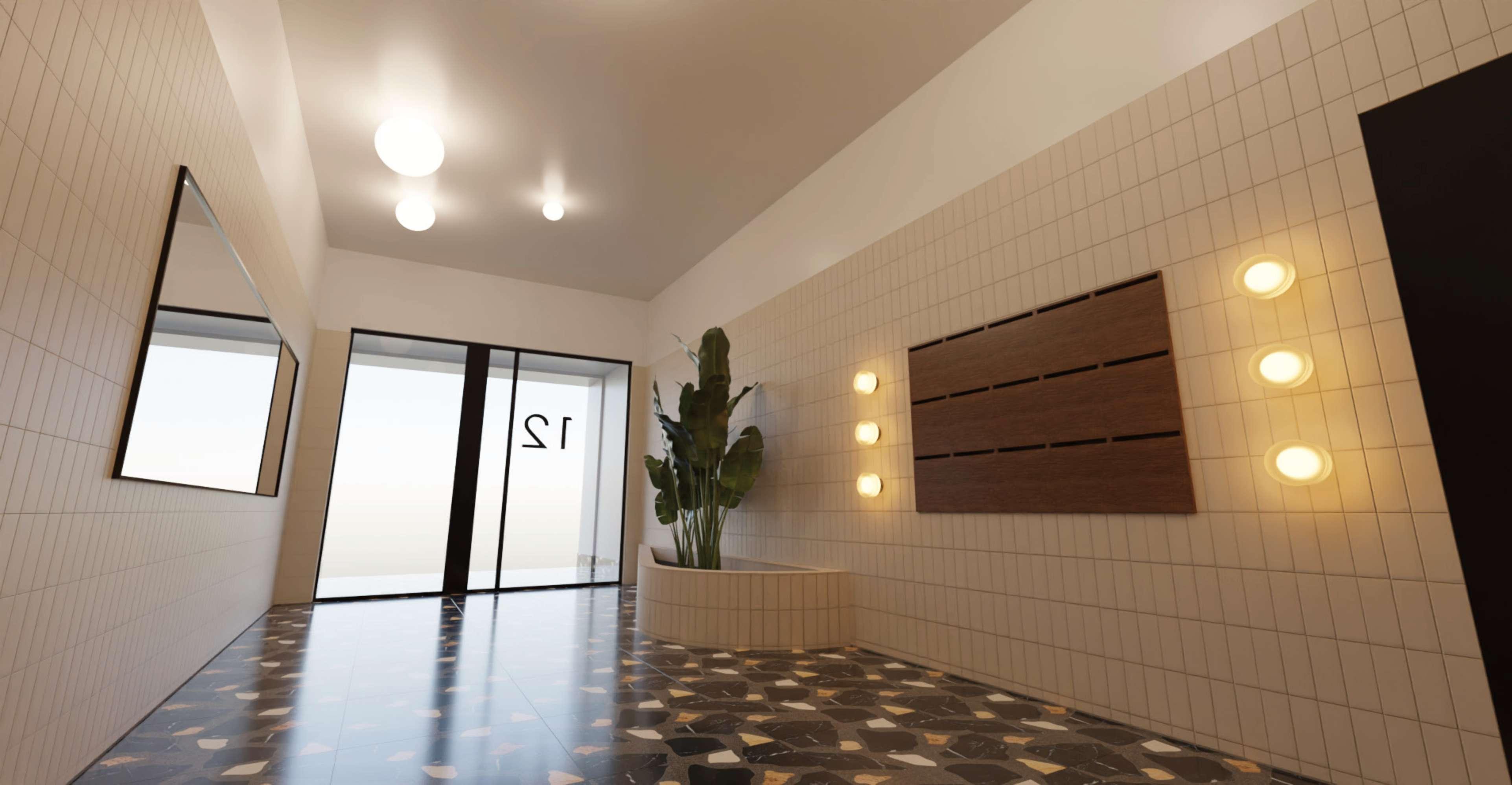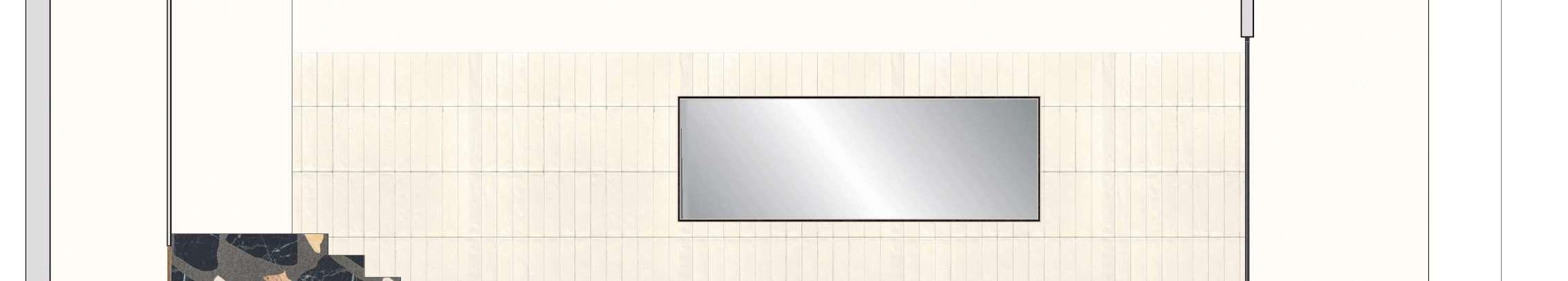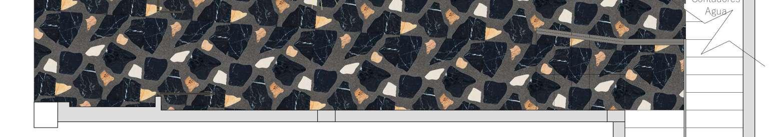 Se elije un pavimento de terrazo como protagonista de este espacio acompañado por un revestimiento de pared de azulejo artesanal en tono neutro para no restar protagonismo al primero.