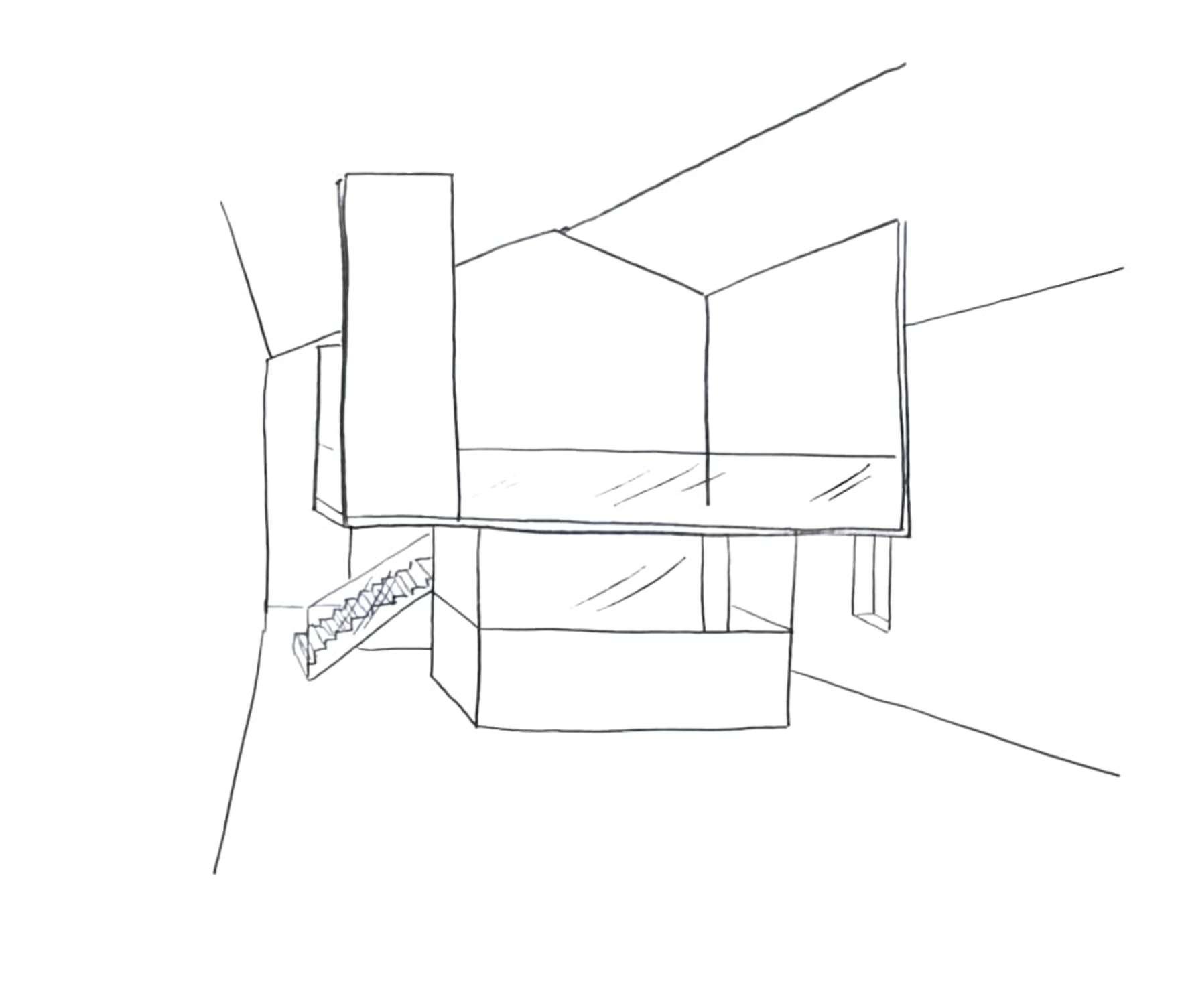 Decidimos crear dos espacios diferenciados en la planta 0 divididos por las escaleras que dan acceso a la planta 1. Gracias a estas escaleras se crean dos zonas opuestas, un espacio público para la exposición y el taller del artista y otra zona privada donde se encuentran la cocina, la sala de estar, la biblioteca y un aseo.