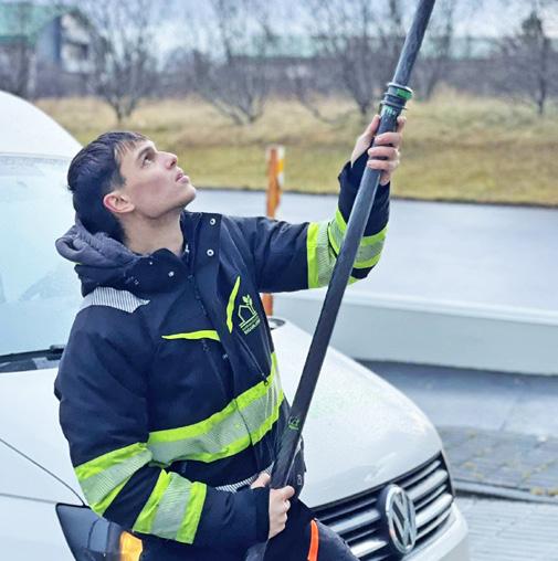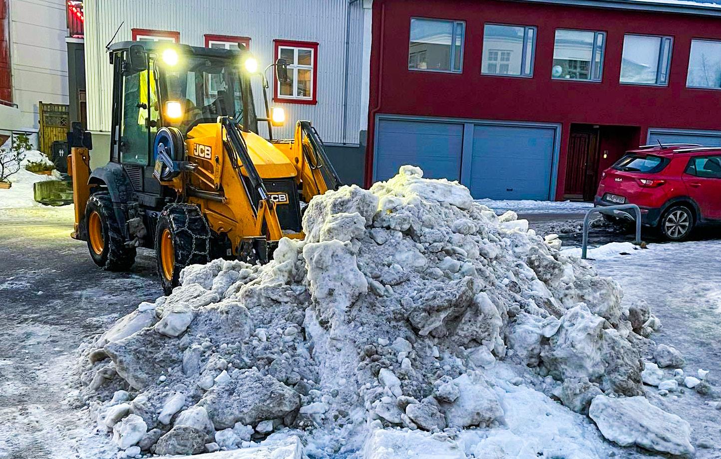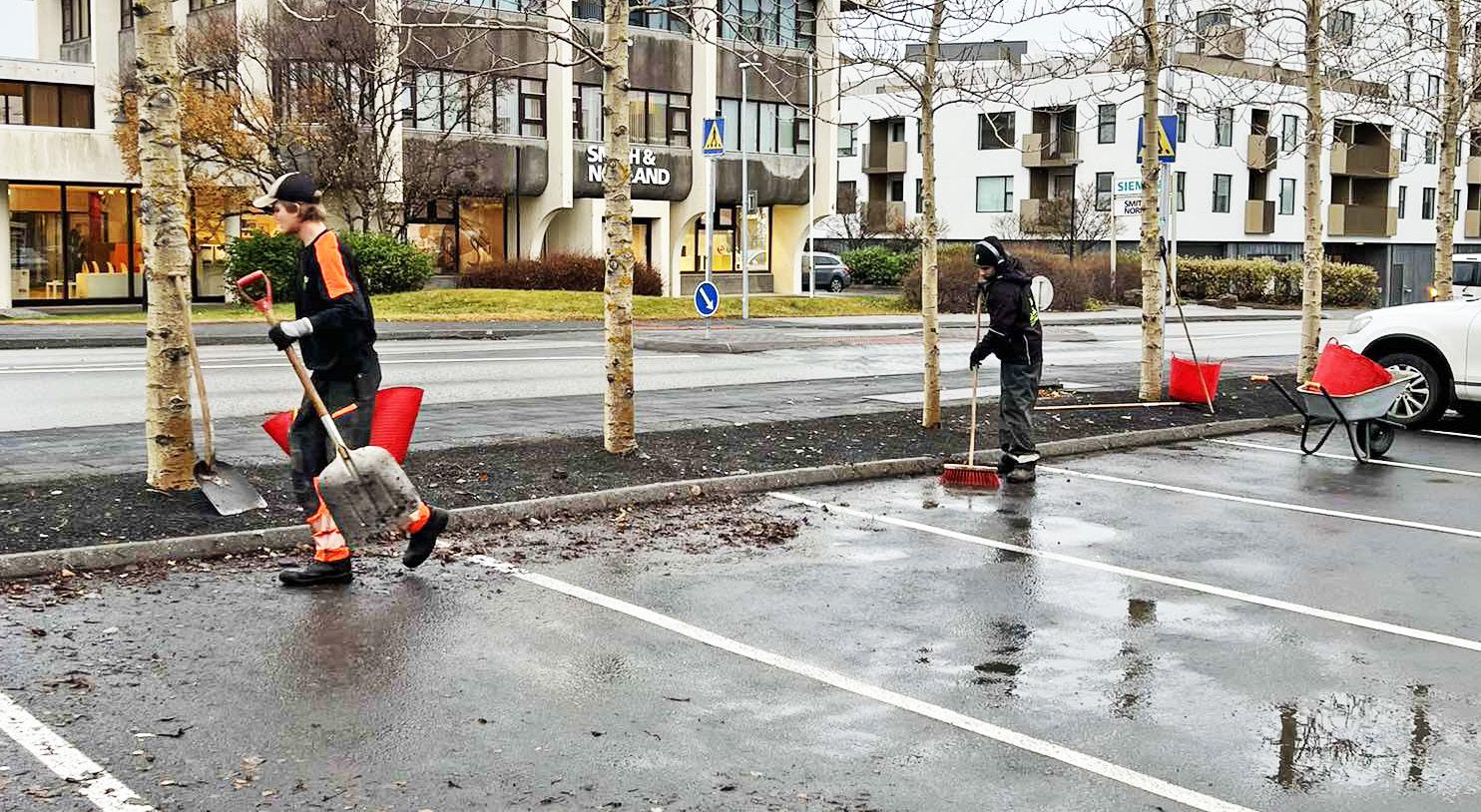 Að hreinsa gangstéttar, götur, bílastæði, bílastæðahús og hesthús.
