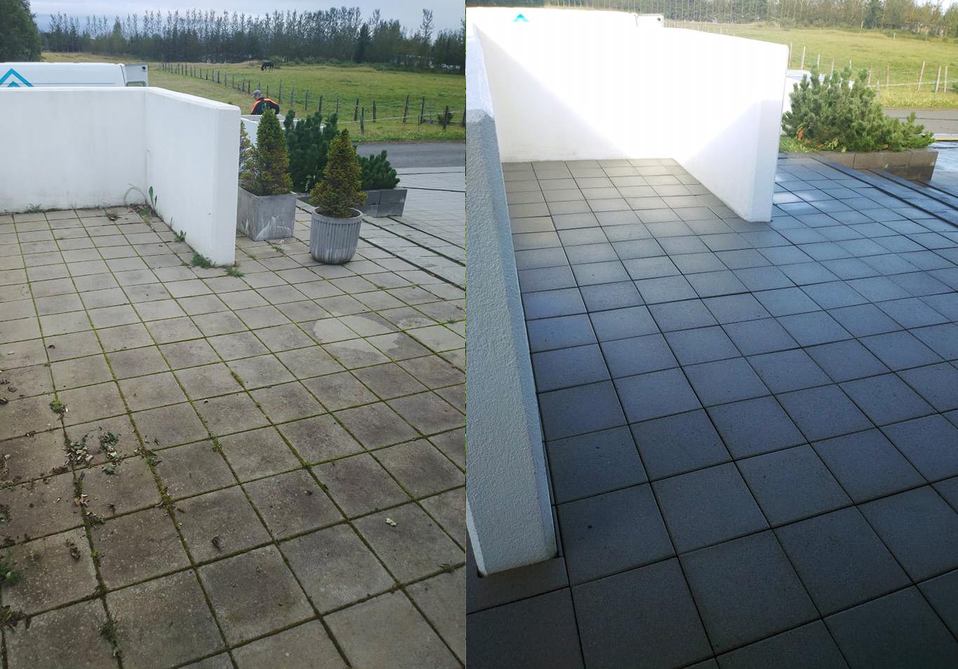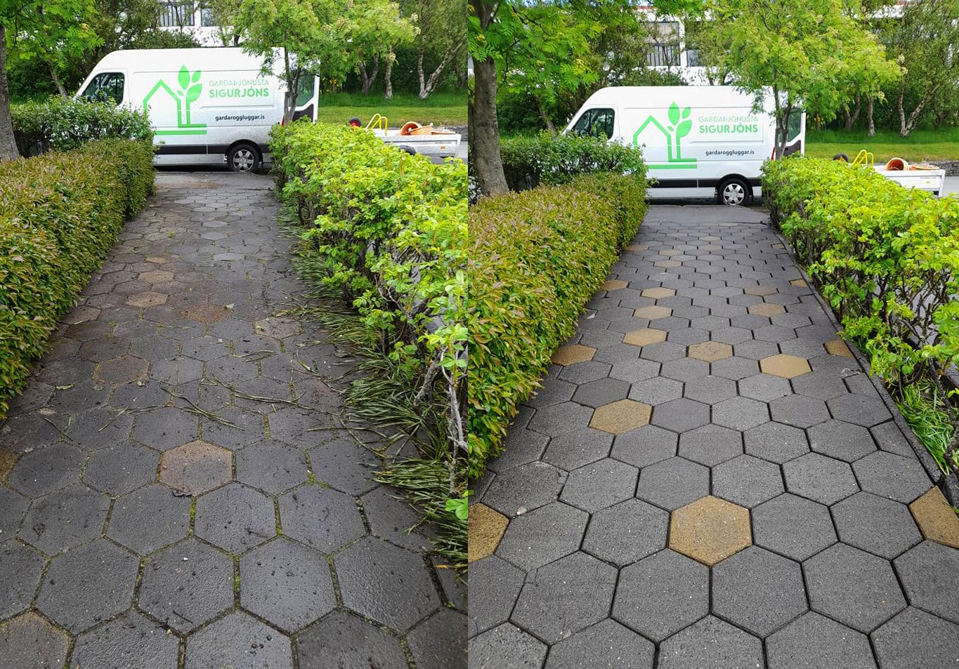 Við bjóðum upp á hellu og gangstéttahreinsun. Við hreinsum arfa og mosa sem vex á milli hellnanna og frískum um leið upp á þær. Að verki loknu er fátt skemmtilegra en að sjá „fyrir og eftir“.