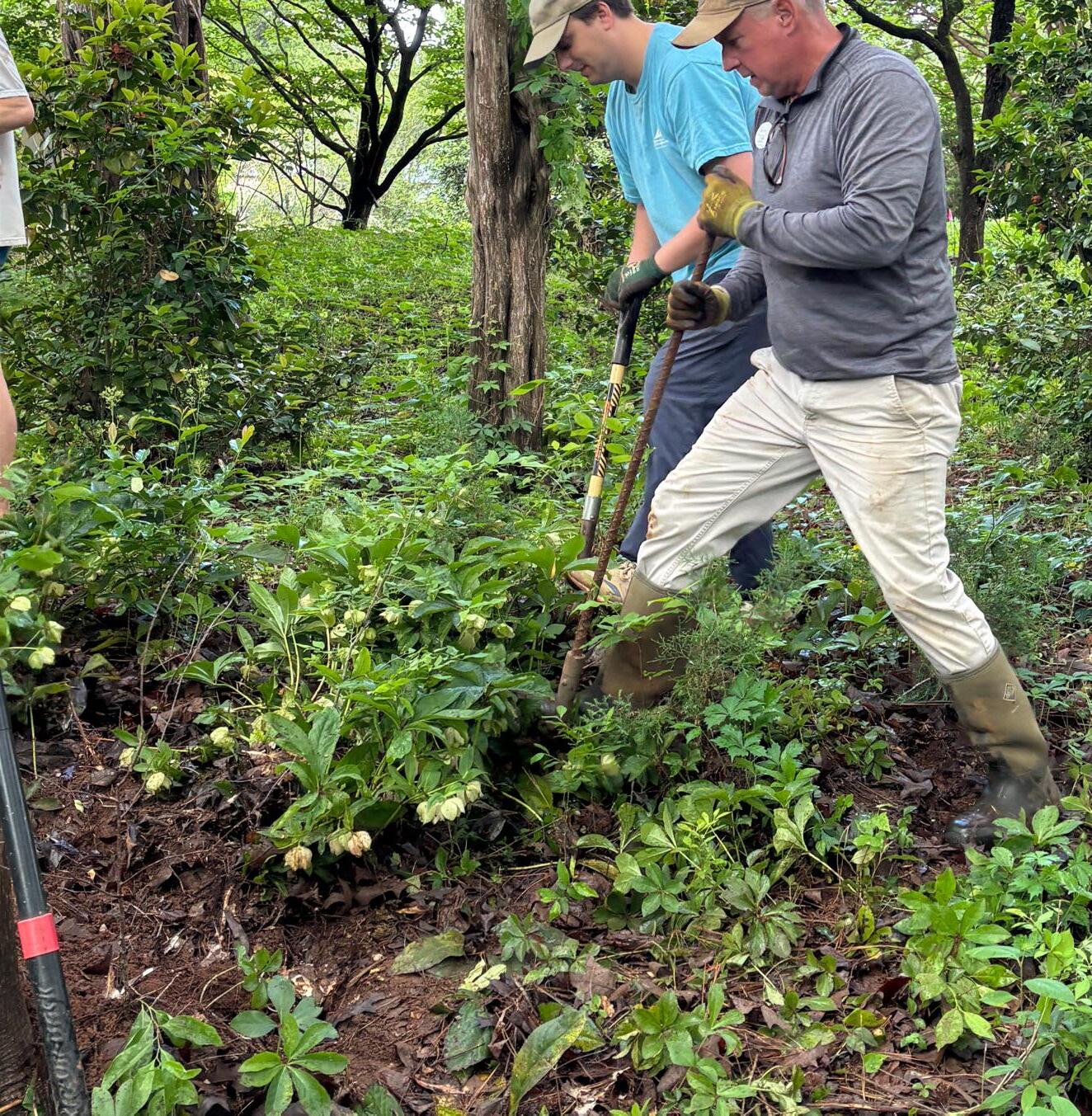 Youth volunteers removing invasives on a garden trail