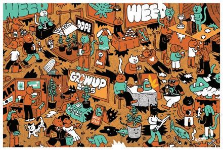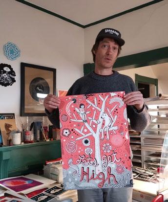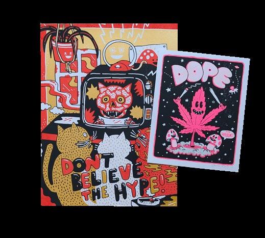 work as screen prints. I draw with pen and paper to start, and then I’ll scan that into the computer and work on the image, assemble it, and add color. The last couple of years, I’ve been moving into more reproductions to supplement the screen prints. I try to keep my art affordable for regular folks, and by selling reproductions, I can sell them cheaper than screen prints. I guess I sometimes think of myself as a psychedelic doodler.