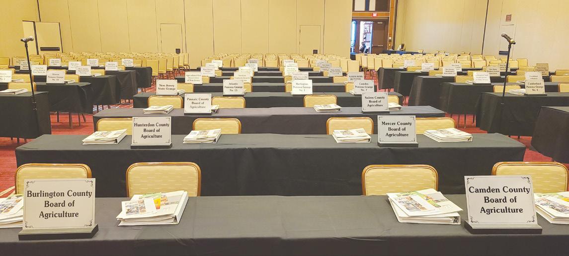 ABOVE: The meeting room is ready for the 2026 Annual State Agricultural Convention Delegates from around the state. Members of the State Board of Agriculture are elected by delegates from the agriculture community to the legislatively established, annual State Agricultural Convention, then recommended to the Governor for appointment to the Board with the approval of the State Senate. Farmer-members of the State Fish and Game Council are also selected at the convention. The State Board of Agriculture is the ruling body that oversees the operations of the New Jersey Department of Agriculture. The delegates elect a State Board, and the State Board oversees the department. Convention delegates also debate resolutions that set the policy path for the department.