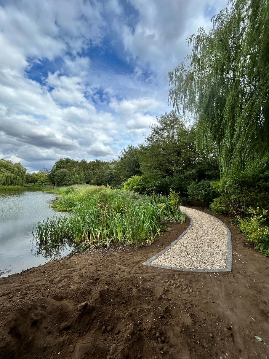 This week and for the last few weeks we have had an additional contractor on site who have been doing some major work to replace a former boardwalk along one side of the lake which had become rotten and dangerous A few weeks ago me and my small team of two removed 80 metres of rotten boards and other structures to leave concrete posts and a bed of gravel ready for the contractors to come in They then added 40 tonnes of crushed tarmac to build up the level to the top of the posts and then this week they have been laying 160 metres of block work to retain a compressed gravel path which although wouldn’t win any awards at Chelsea is functional and in my opinion equally beautiful as it retains the same curving shape that the boardwalk once did This has been a no-go area for about 4 years so it’s incredible to see it transformed after years of indecision and frankly ridiculous quotes from all sorts of different companies one of which was six figures!