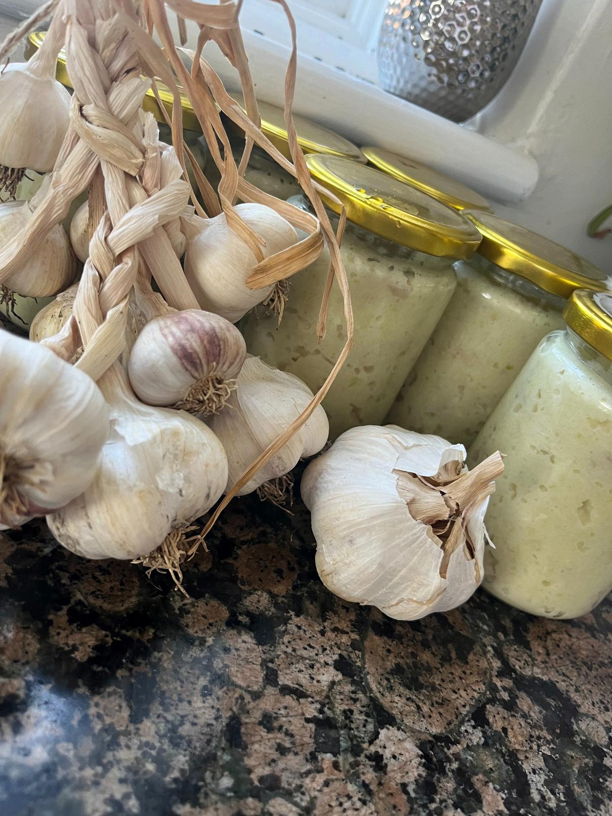Alongside tomatoes, they are definitely our winning crop each year We got the garlic bulbs from The Garlic Farm on the Isle of Wight and planted each clove individually in October last year. We will be ordering more garlic from them for this winter as they are such good quality. If you happen to be catching a ferry over that way, I definitely recommend visiting The Garlic Farm shop and restaurant. We harvested the garlic at the beginning of July and let them dry out in our greenhouse until we were ready to make our lazy garlic mid-August.