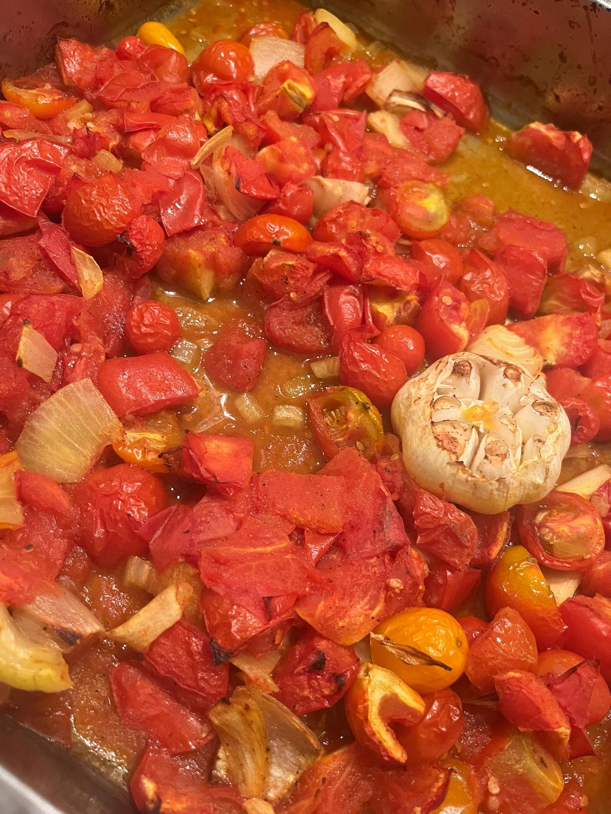 A roasting tin of tomatoes (a single layer) Chop the larger ones so they are all roughly the same size for even cooking.