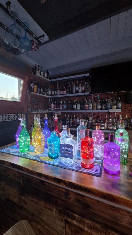 Next came fixtures and fittings. Mr P set to work building an actual bar using the wood from the pallet that the log cabin had arrived on, along with some old scaffolding boards. Shelving was made from old scaffolding boards and recycled brackets from Great Western Railway dating back to 1833. There’s a fantastic wood recycling centre in Southampton where we got the scaffolding boards and the brackets from. It took another 8 months for ‘The Dirty Hoe’ to be the amazing entertaining space she is today, complete with spinning mirrorball!