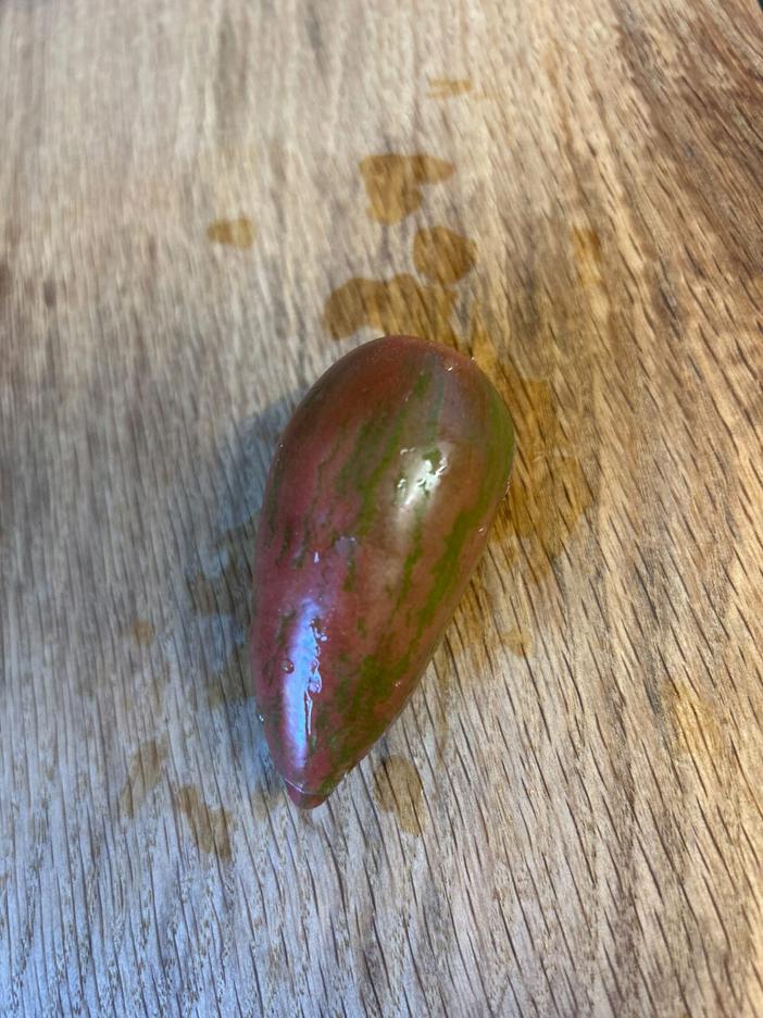 An artisan tomato that was gifted to me by a gardener at the Ramsey Walled Garden in Cambridgeshire when we shared lunch one day last summer. Cute, oval and stripey like a bee (the tomato, not the gardener). A really pretty ovoid shape with a patination of attractive oranges and yellows. Stunning flavour Sweet and tangy