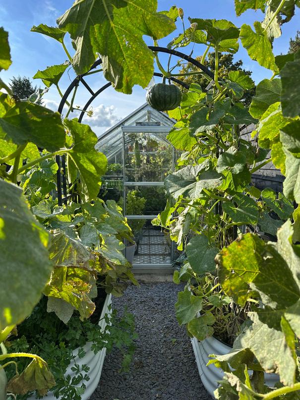 What a glorious September of sunshine we had - long may it continue into autumn This is our first Autumn of having a greenhouse and it’s bringing me so much joy It's the perfect place to potter around with a cuppa and the morning sun creates a wonderful balmy retreat Currently growing inside, we have a young lemon tree, chillies, peppers, basil and tomatoes