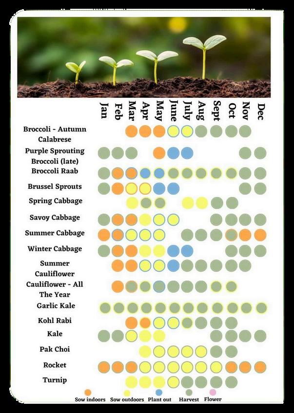 Some brassicas are bred for summer harvest, others for winter. Matching the variety to the season is key. The calendar below gives you an overview of what the GFM Grow-Along year will look like.