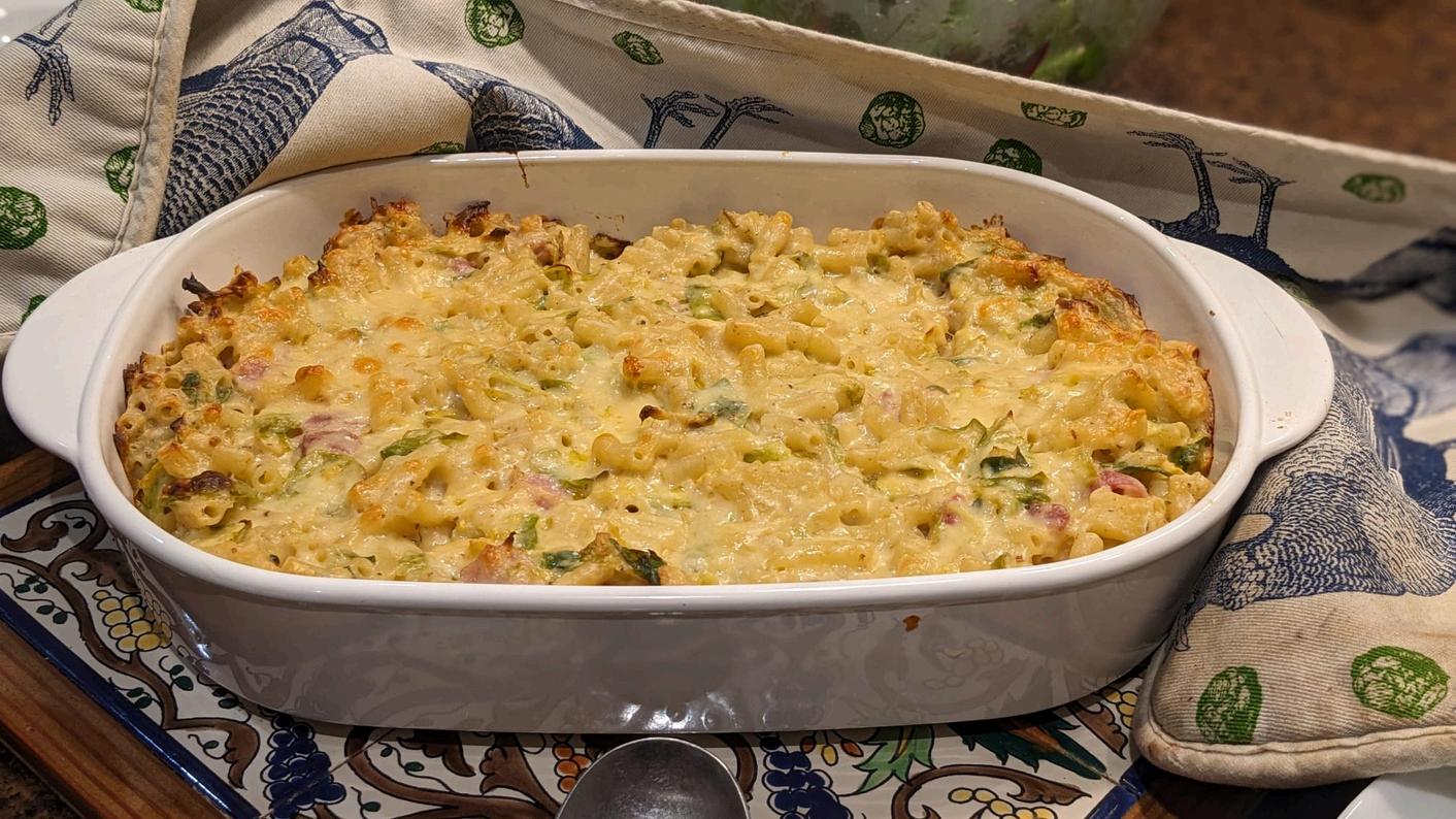 7 Add your macaroni, sprouts, bacon and thyme back into the sauce and coat fully. Transfer to a baking dish and sprinkle the remaining cheddar over the top and bake in the oven for 20 minutes until molten and bubbling. Serve with a side salad and vinaigrette.