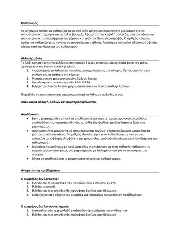 Αλλαγή λαδιών Το λάδι αρχικά πρέπει να αλλάζεται στις πρώτες 5 ώρες εργασίας, και μετά μία φορά τον χρόνο. Χρησιμοποιήστε ένα κιτ αλλαγής λαδιών. 1. Αναρροφήστε το λάδι μέσω της οπής χρησιμοποιώντας μία σύριγγα. Χρησιμοποιήστε τον σωλήνα για να φτάσετε στο κάρτερ. 2. Μεταφέρετε το χρησιμοποιημένο λάδι σε δοχείο. 3. Τοποθετήστε στον κινητήρα νέο λάδι SAE30 4. Ελέγξτε τα επίπεδα λαδιού χρησιμοποιώντας των δείκτη στάθμης λαδιού. Θυμηθείτε να απομακρύνεται τα χρησιμοποιημένα λάδια σε ασφαλές μέρος. Λάδι και κιτ αλλαγής λαδιών δεν συμπεριλαμβάνονται.