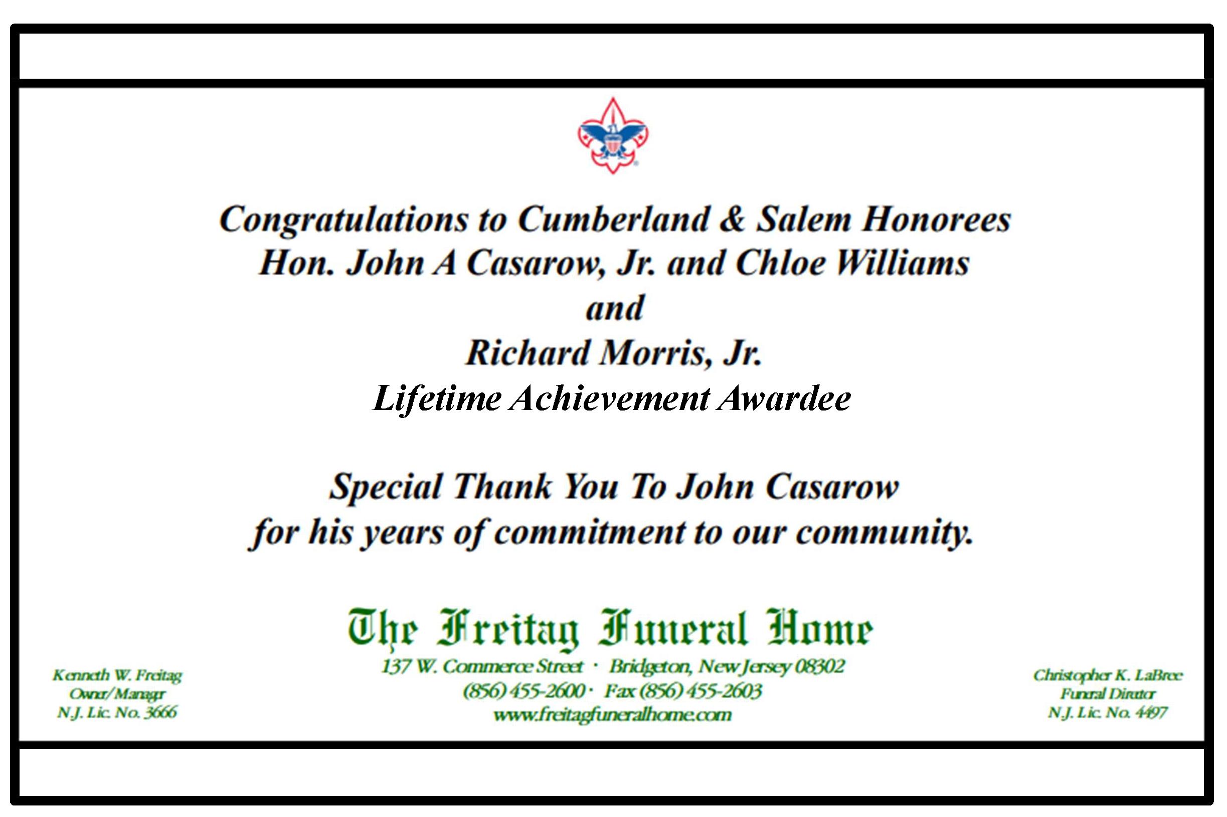 CONGRATULATIONS to Hon. John A. Casarow Jr. Cumberland County Honoree and to Chloe Williams Salem County Honoree “DISTINGUISHED CITIZEN OF THE YEAR” Civil Engineering • Land Surveying • Environmental Services 629 SHILOH PIKE BRIDGETON, NJ 08302 856-451-2990 (PHONE) 856-451-6536 (FAX) WWW.FRALINGER.COM
