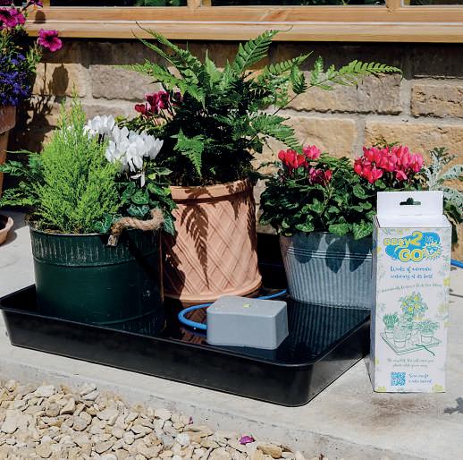 easy2GO perfectly preserves potted plants for growers whilst they’reaway.All they need do is gather their potted plants together on agarden tray.Place easy2GO onto the tray and connect it to awater supply.Switchonthe supply and you’re away!